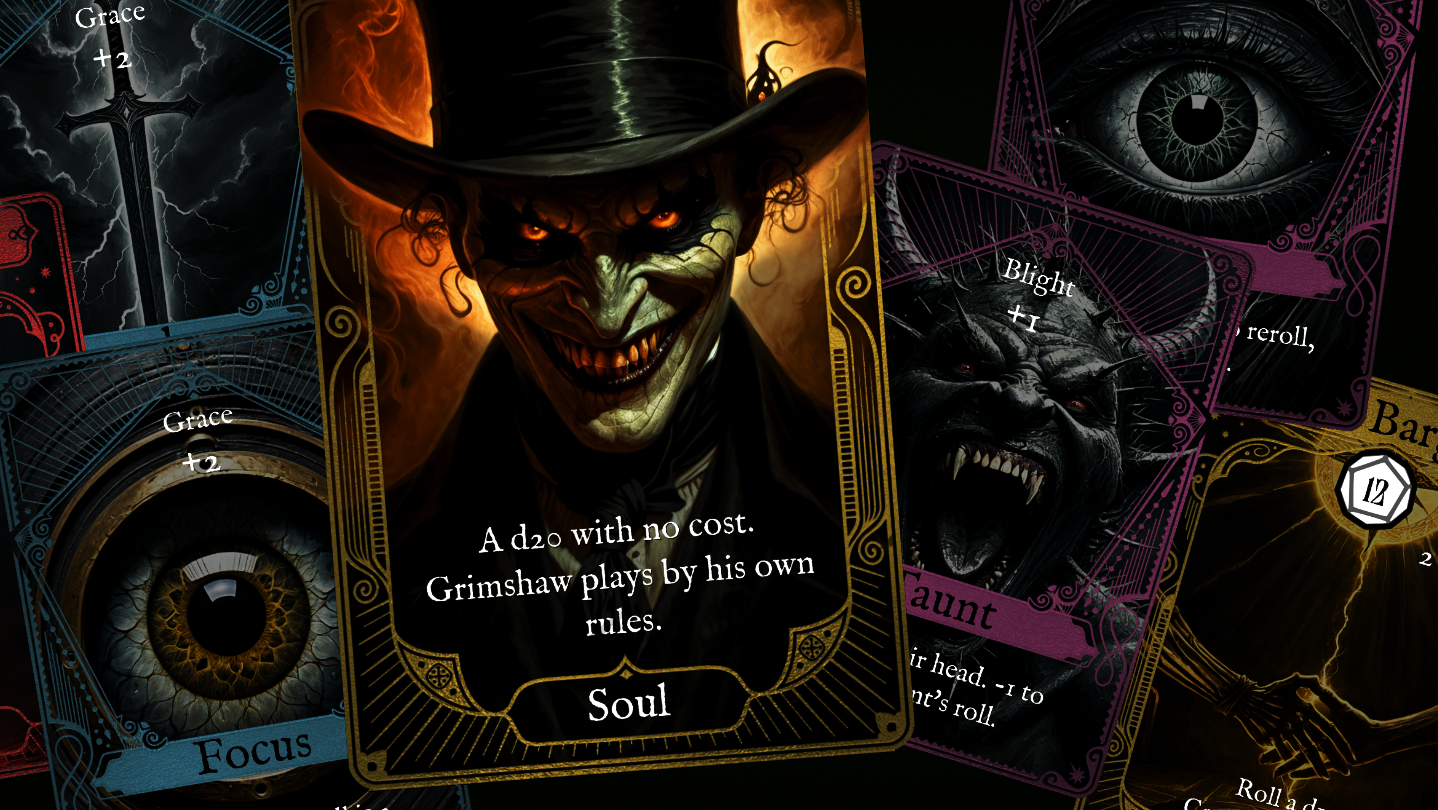 A gothic 1v1 card-and-dice battler where you draft stronger dice, hide brutal effects, and bleed for power at Grimshaw's table.