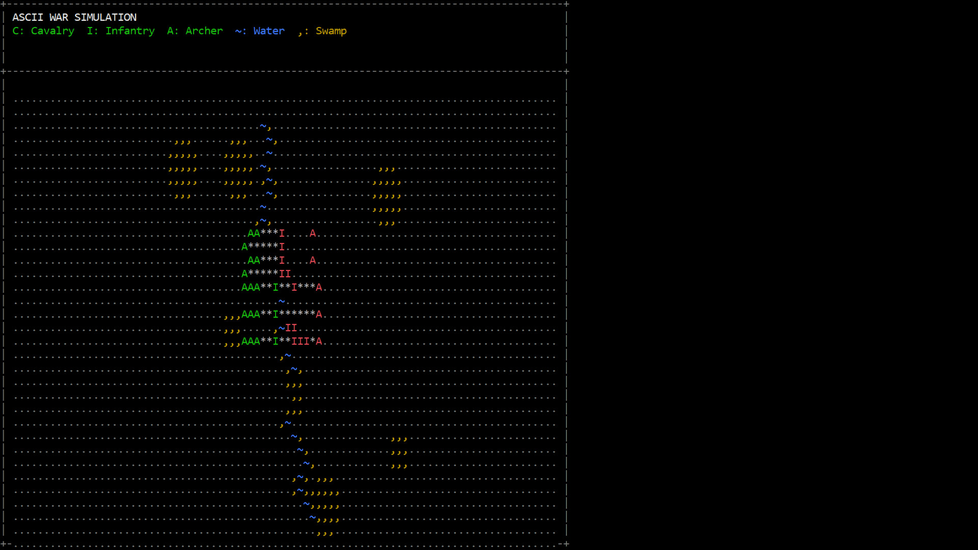 Whether you are raiding a village, laying siege to a city, or engaging an enemy state in open battle, the sword rules all. But without tactical planning, all of it is meaningless! Before battle, your commanders will provide you with a detailed tactical decision map (yes, in ASCII graphics). You must analyze the terrain and the enemy, then devise an appropriate battle plan.