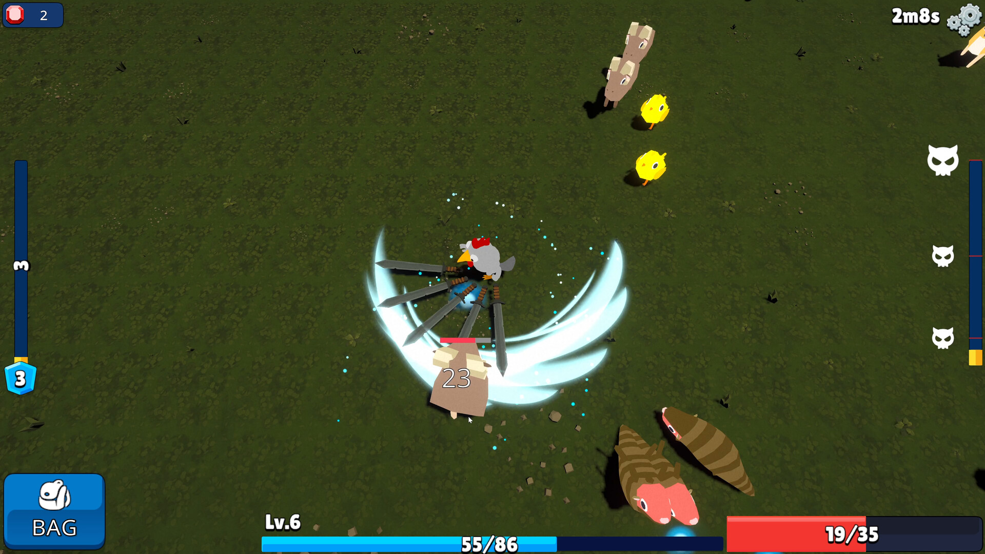 "Vicious" animals will continuously spawn and chase and attack you. Throwing weapons at your enemies to defeat them. Collecting experience points dropped by enemies to level up. Every time you level up, you can enter the shop to buy items to enhance your character. You’ll win when the timer ends.