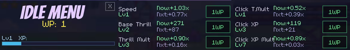 While your coaster runs, a lightweight idle layer runs with it. Tap decorations to generate bonus thrill and XP. Level up during the ride to earn Win Points, then spend them on run-scoped upgrades: crank up simulation speed, boost base thrill per segment, or juice your click power even further. Veterans start each run with more Win Points based on how many unique win combinations they've racked up. It's entirely opt-in: ignore it and you'll still finish the run. Lean into it and the numbers get very silly very fast.