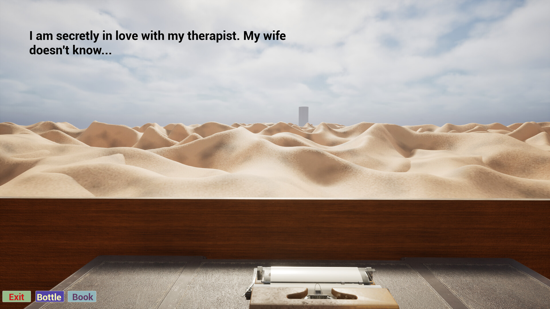 A hut on a desert island. A typewriter. Write what's on your mind — the angry email you'll never send, the thing you need to let go of, the thought that's been circling for days. Bottle it. Throw it into the ocean or burn it in a fire. Release it. Let it go.