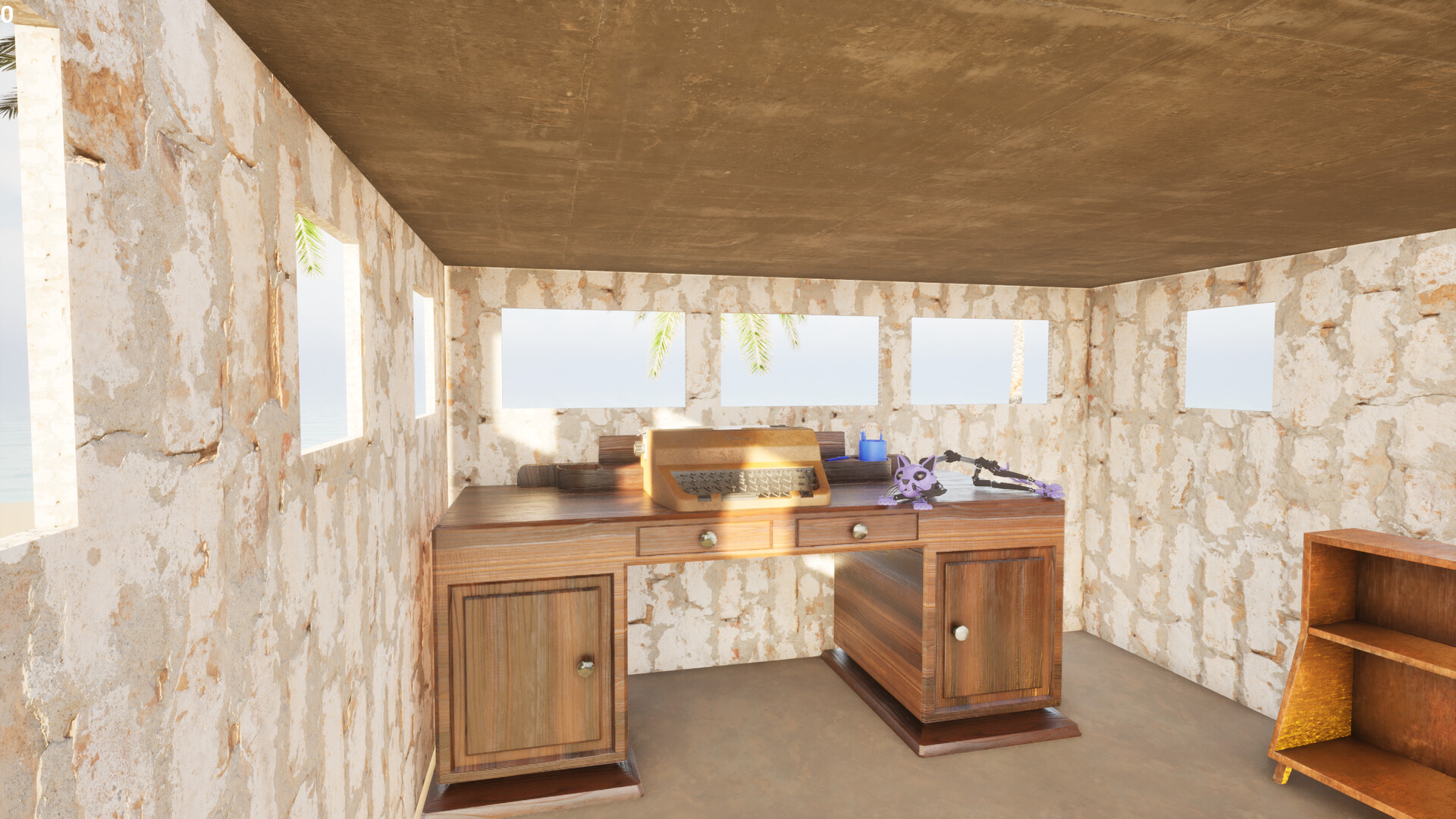 A hut on a desert island. A typewriter. Write what's on your mind — the angry email you'll never send, the thing you need to let go of, the thought that's been circling for days. Bottle it. Throw it into the ocean or burn it in a fire. Release it. Let it go.