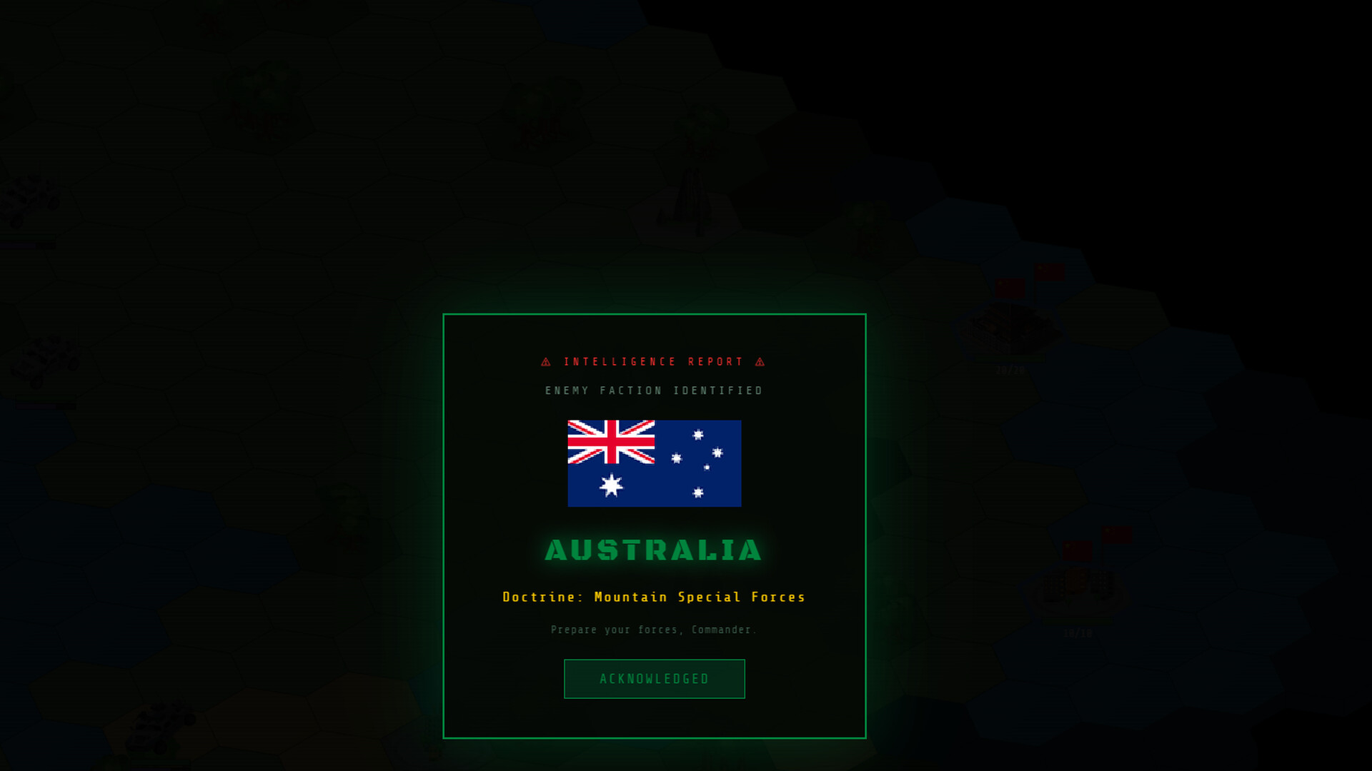 Command one of 10 doctrine-driven factions in a turn-based hex war where fog of war, terrain, and unit composition decide every engagement. Draft your army, seize territory, and outmaneuver your enemy across procedurally generated battlefields. Every decision is final. Every hex matters.