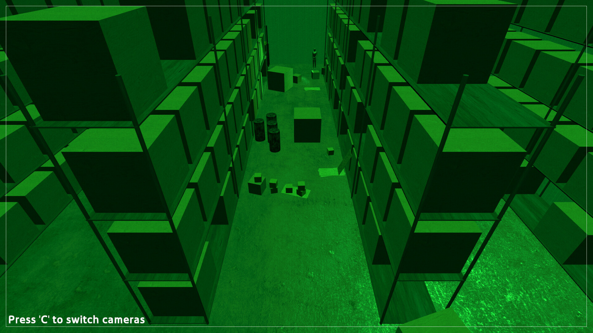 This game requires you to get from the beginning to the end of the area without tripping over an object. The security cameras have awkward angles that require you to go slowly to prevent you from tripping. Choose your difficulty. If you choose easy, you'll have night vision to be able to see where the player is. If you choose hard, night vision is disabled, leaving only the flashlight as your source of light.