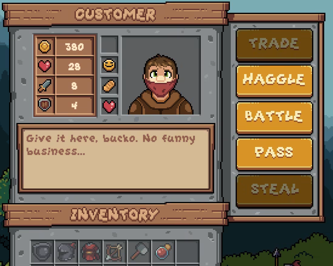 STEAL: High risk, high reward. Attempt to steal an item straight from a customer's inventory and you might walk away with free loot... or you might find yourself taking damage before they leave you high and dry! Measure your marks wisely by looking at their stats, traits, inventory, and wallets!