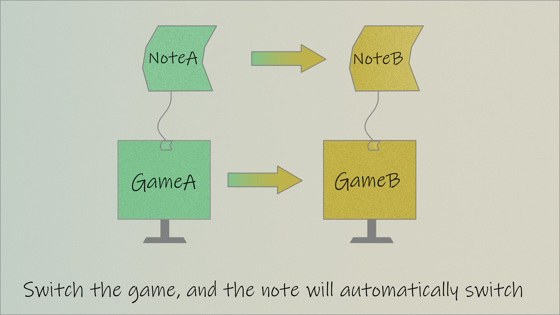 เมื่อเปิดเกม (หรือซอฟต์แวร์) หน้าต่างบันทึกย่อจะสลับไปยังกลุ่มบันทึกย่อที่ผูกกับเกม (หรือซอฟต์แวร์) โดยอัตโนมัติ