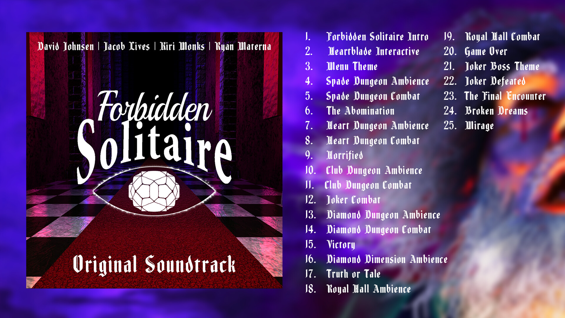 The Forbidden Solitaire OST features 25 haunting tracks featuring the work of composers David Johnsen, Jacob Lives, Ryan Materna and the original single "Mirage" by occult rock group, Graveyard Violet.