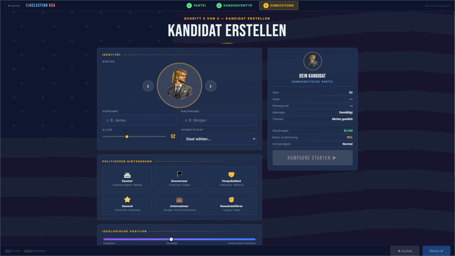 Erstelle deinen Kandidaten, forme deine Botschaft und navigiere durch ein System, in dem Geld, Medien, Einfluss und Timing über den Ausgang entscheiden.