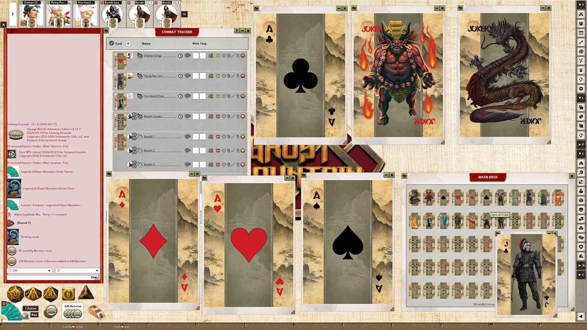 This custom Action Deck consists of 54 oversized playing cards to help keep track of the action around the table featuring art from the Legend of Ghost Mountain. The Action Deck is used to count down initiative, determine random events, run Dramatic Tasks, and much more.Custom Action Decks make your games more immersive and fit the theme of your campaign better than the default Action Deck that comes with the ruleset.Select a custom Action Deck that fits your play style and helps your players get into the action.This deck can be used in any campaign, and does not require the purchase of any specific setting or Companion.