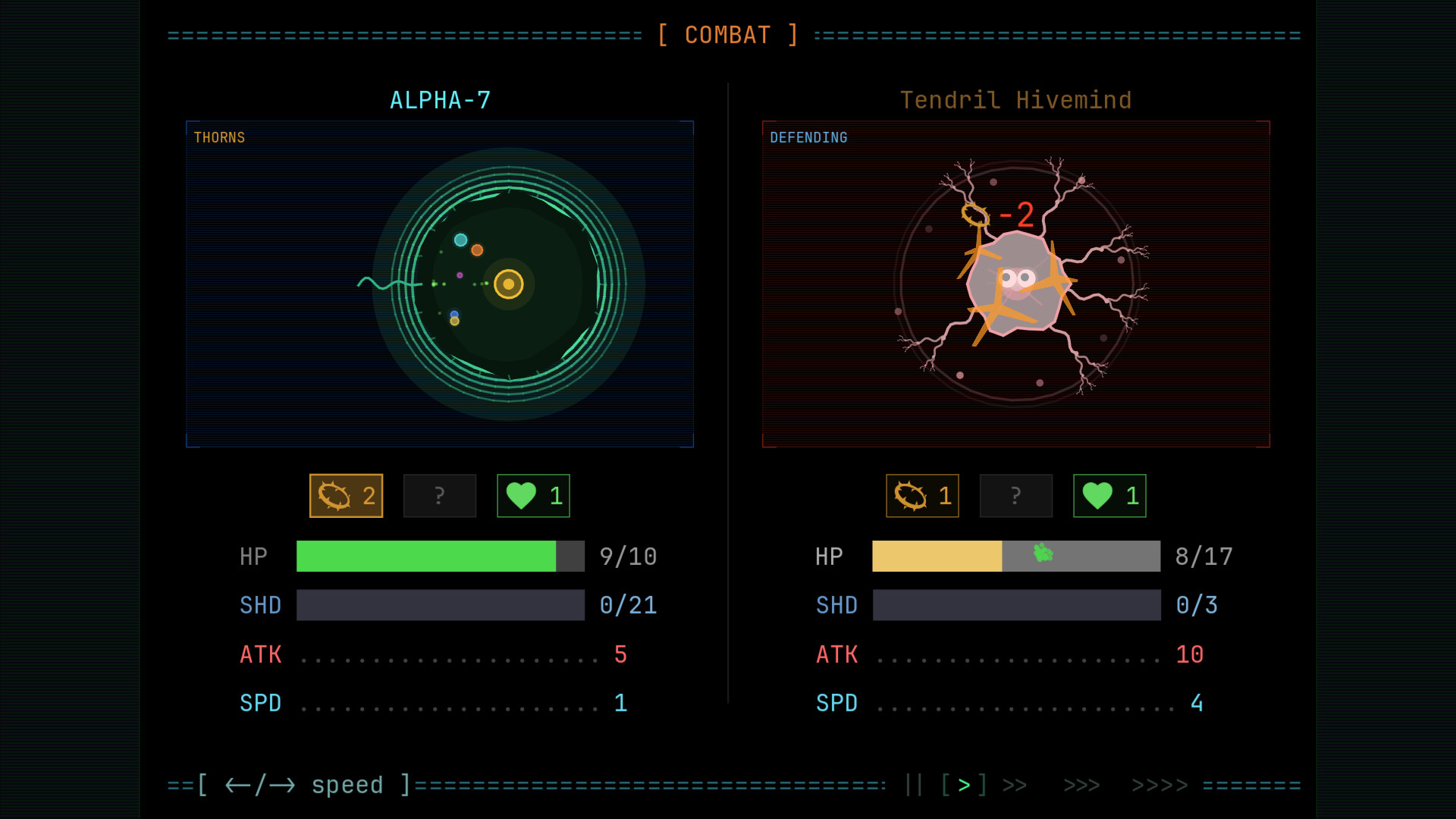 Explore ever more threatening star systems each with its own branching node map. Every path and every fork is a tradeoff. Dangerous nodes guard better salvage. Safe routes gather fuel or health but starve your specimen of power. Fuel is your lifeline. When it runs out, the run ends whether you're ready or not. There's no perfect route. Just the one you can afford.