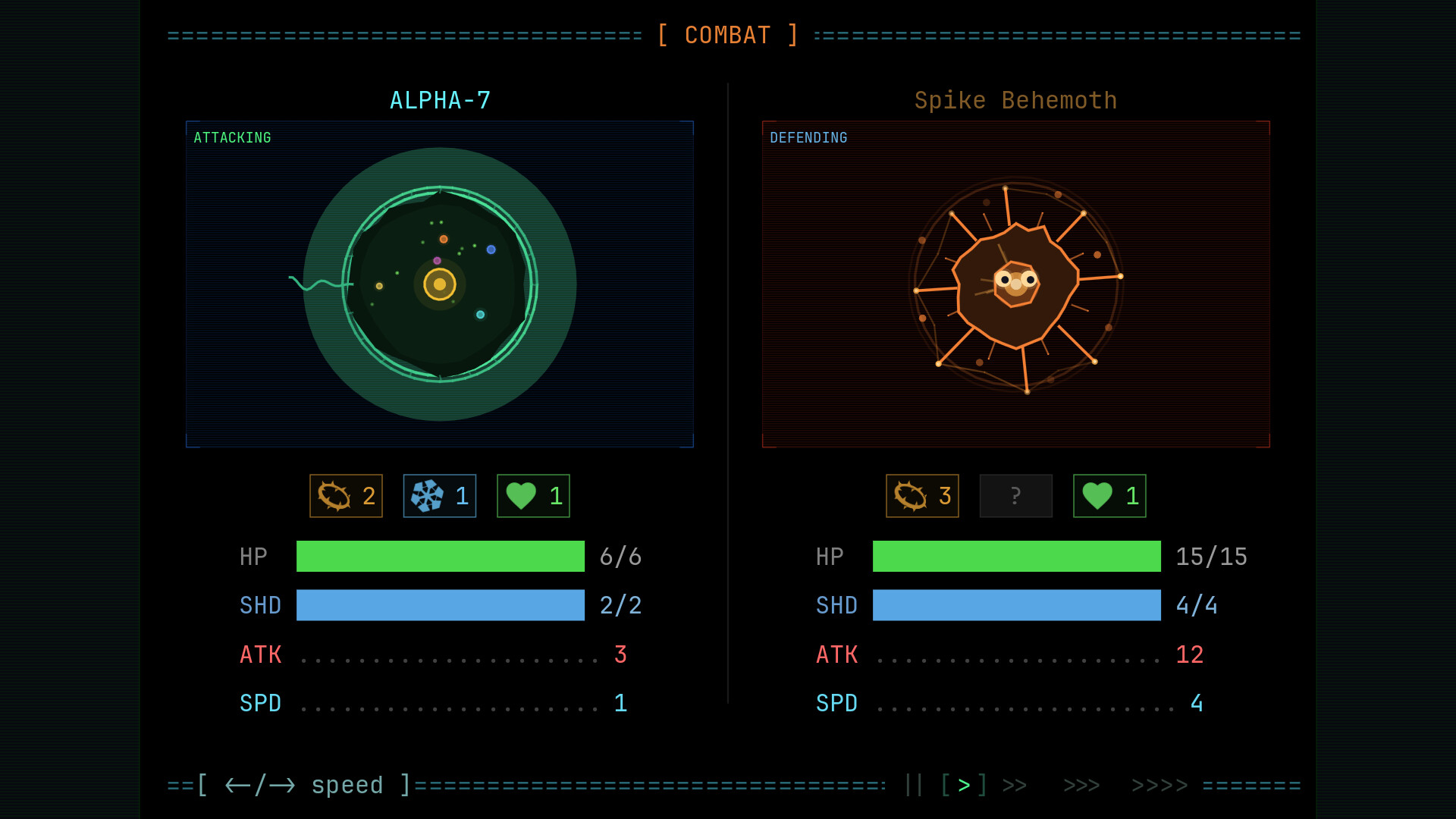 Explore ever more threatening star systems each with its own branching node map. Every path and every fork is a tradeoff. Dangerous nodes guard better salvage. Safe routes gather fuel or health but starve your specimen of power. Fuel is your lifeline. When it runs out, the run ends whether you're ready or not. There's no perfect route. Just the one you can afford.