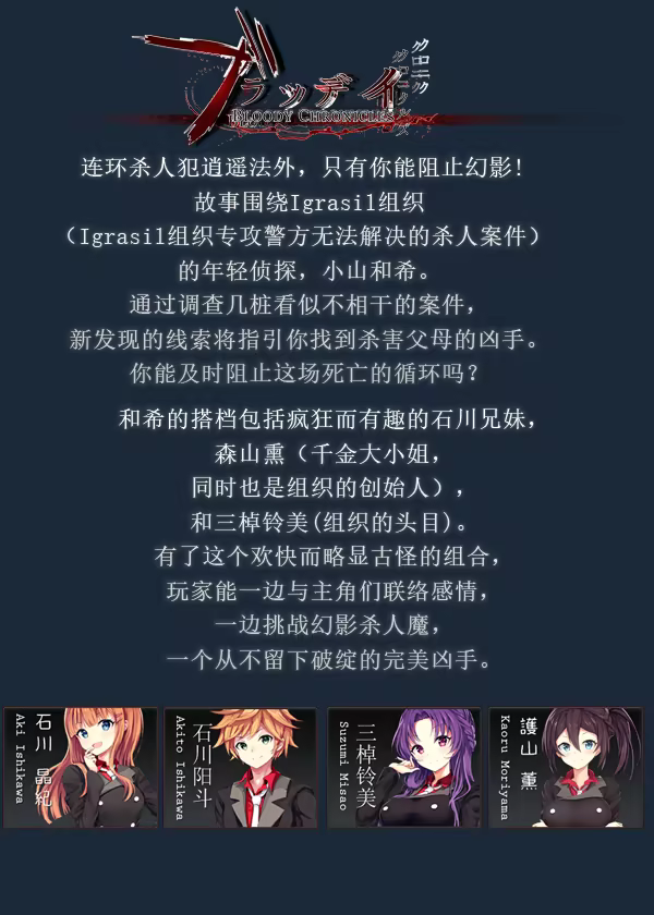 连环杀人犯”幻影”逍遥法外,只有你能阻止他! 故事围绕Igrasil组织的年轻侦探,小山和希。 通过调查几桩看似不相干的案件,新发现的线索将指引你找到杀害父母的凶手。 接二连三的连环命案,你阻止的了吗?