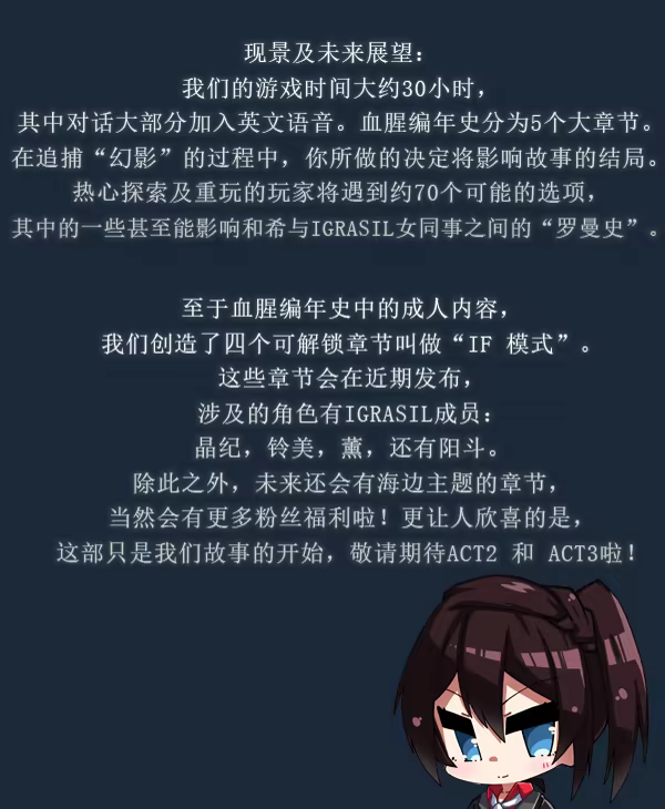 连环杀人犯”幻影”逍遥法外,只有你能阻止他! 故事围绕Igrasil组织的年轻侦探,小山和希。 通过调查几桩看似不相干的案件,新发现的线索将指引你找到杀害父母的凶手。 接二连三的连环命案,你阻止的了吗?