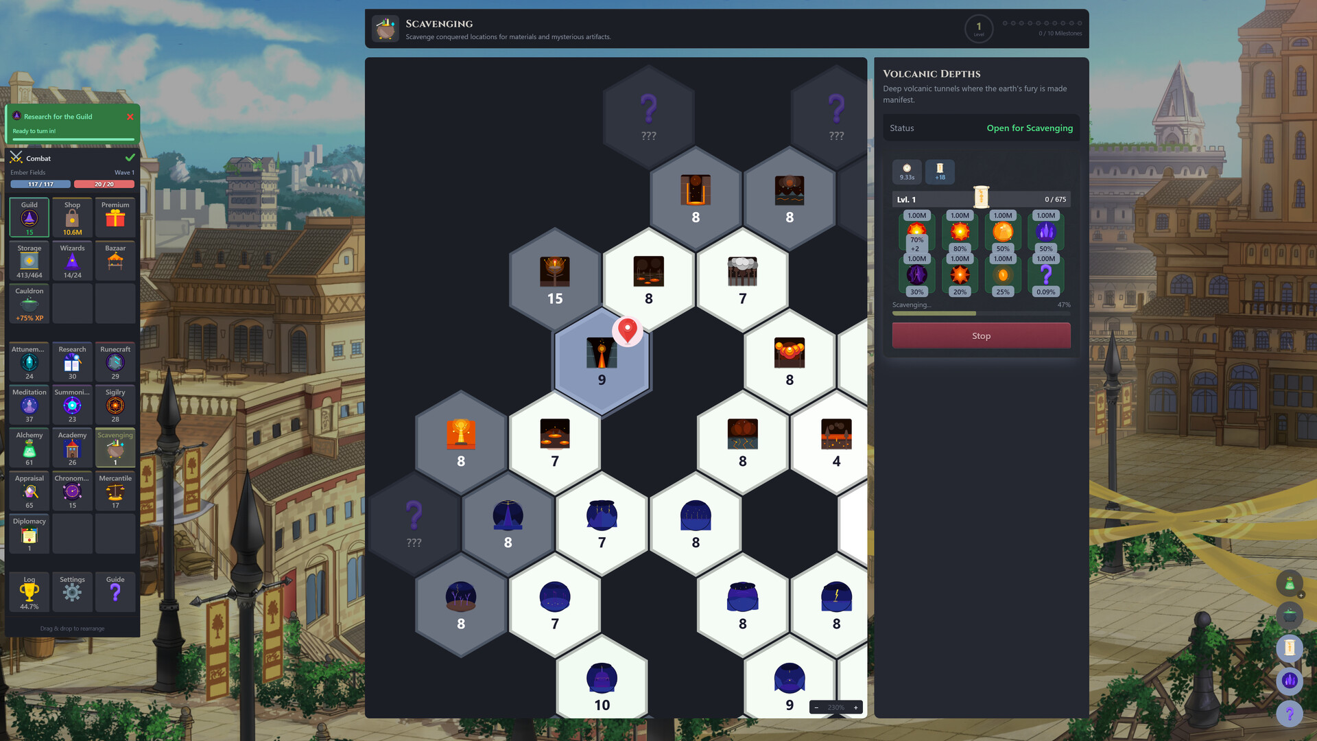 An idle/incremental RPG with deeply interconnected skills. Your skills feed the frontlines: Attunement, Summoning, and Sigilry power your wizards as they fight across an elemental hex map. Your skills feed the supply lines: Research, Runecrafting, Alchemy, Mercantile, and Scavenging keep the resources flowing. And skills you won't find anywhere else, like Chronomancy, Diplomacy, and Appraisal, tie it all together.