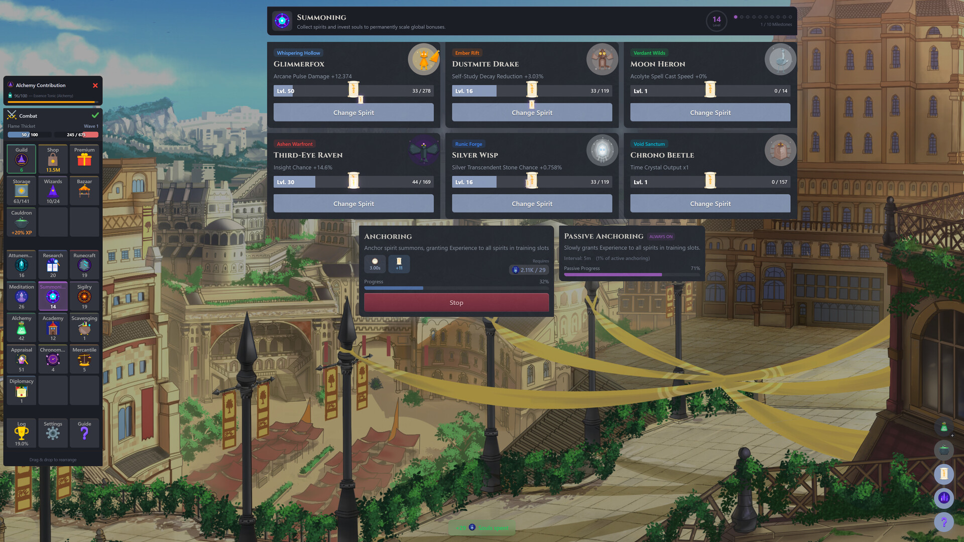 An idle/incremental RPG with deeply interconnected skills. Your skills feed the frontlines: Attunement, Summoning, and Sigilry power your wizards as they fight across an elemental hex map. Your skills feed the supply lines: Research, Runecrafting, Alchemy, Mercantile, and Scavenging keep the resources flowing. And skills you won't find anywhere else, like Chronomancy, Diplomacy, and Appraisal, tie it all together.