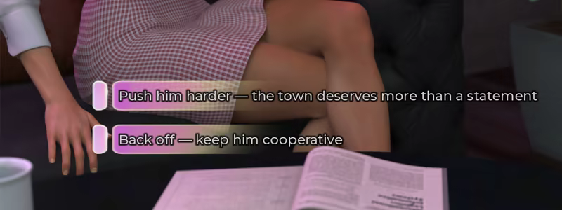 Mature content is integrated into the narrative and becomes accessible through story progression and player choices. Certain scenes are triggered by specific dialogue decisions and events during the investigation.