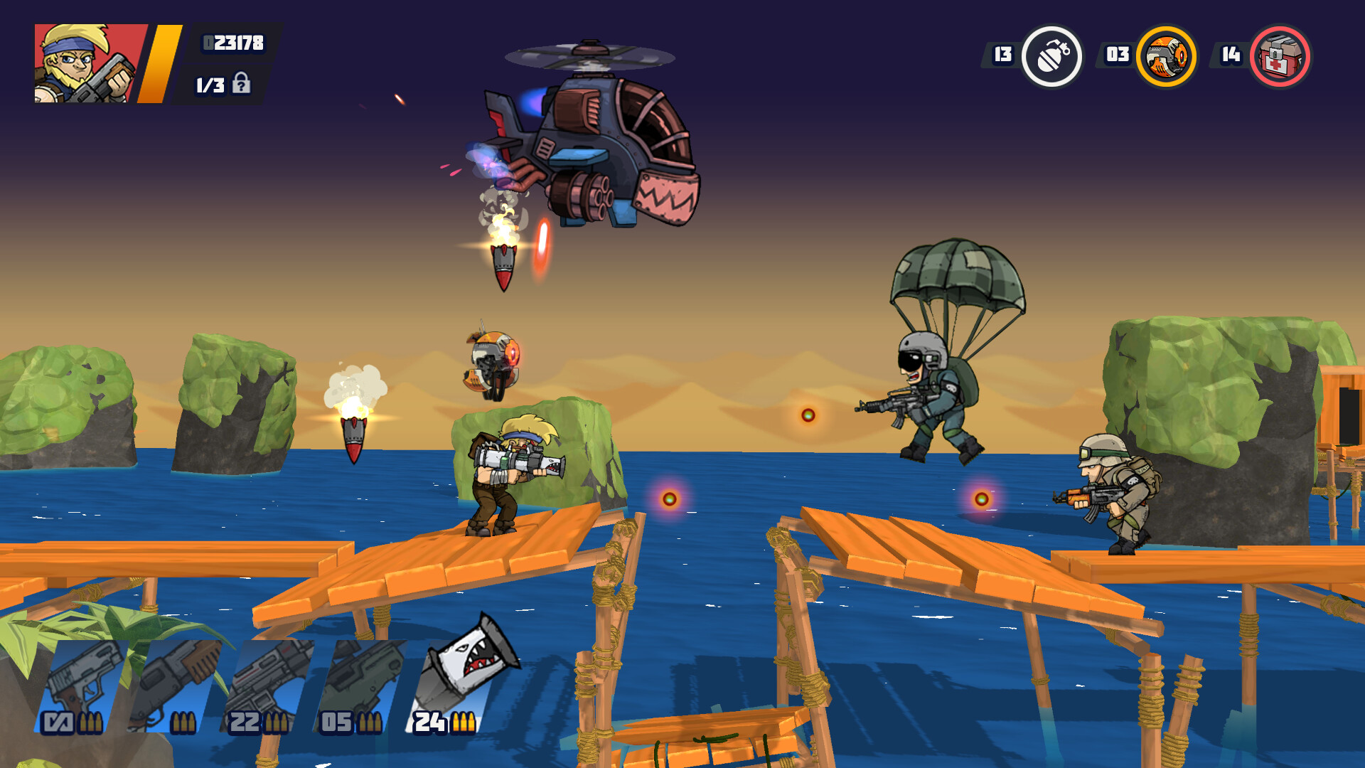 Jump into a run-and-gun shooter inspired by classic arcade hits. Step into the boots of a lone soldier and fight your way through a rebel army in chaotic battles filled with bullets, destruction, and massive enemies… yes, even dinosaurs.