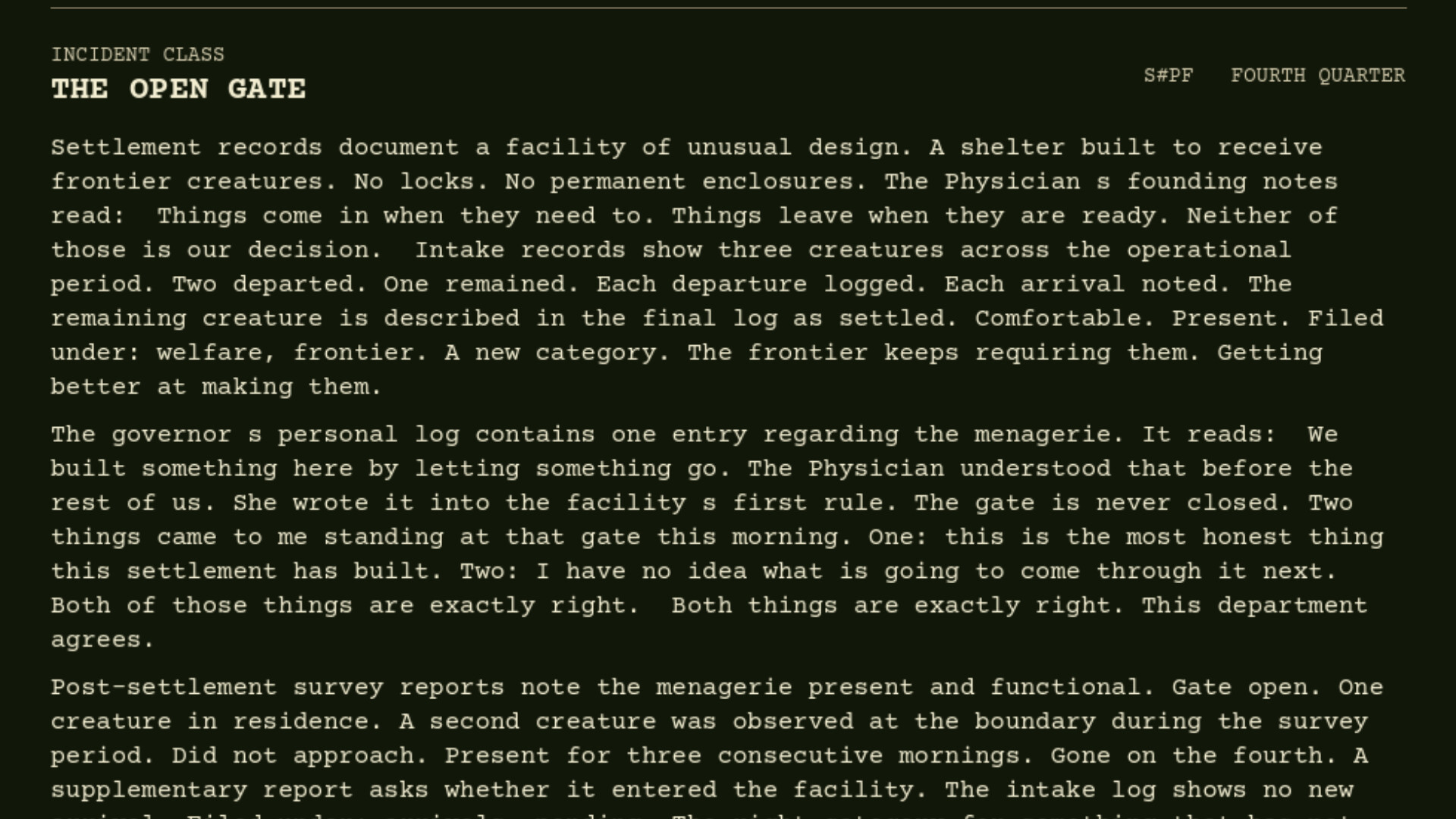 Settlements on the frontier are subject to a number of environmental pressures not observed in standard imperial territories. These pressures are measurable. They are documented. Their cause is, at present, a matter of some disagreement between this department and BM&PR.