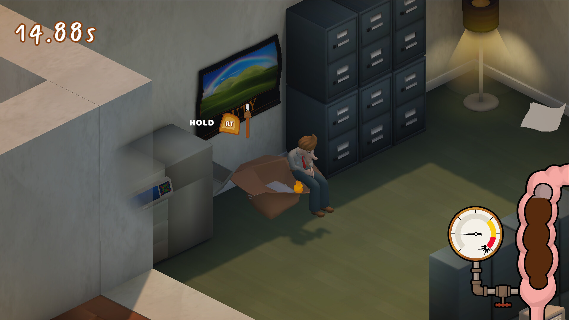 Play as Loo‑is, an overworked office drone with an urgent biological crisis. The bathroom is closed, the pressure is rising, and your coworkers are everywhere. Sneak through cubicles, hallways, and break rooms while hunting for creative receptacles like coffee mugs, trash cans, and anything else that can contain the… situation.