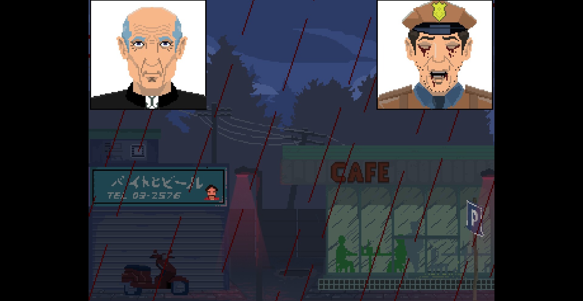 Paradise Falls features stylised pixel art depictions of graphic violence, blood, and gore. The narrative explores unsettling psychological themes, including intrusive thoughts and blurred perceptions of reality.