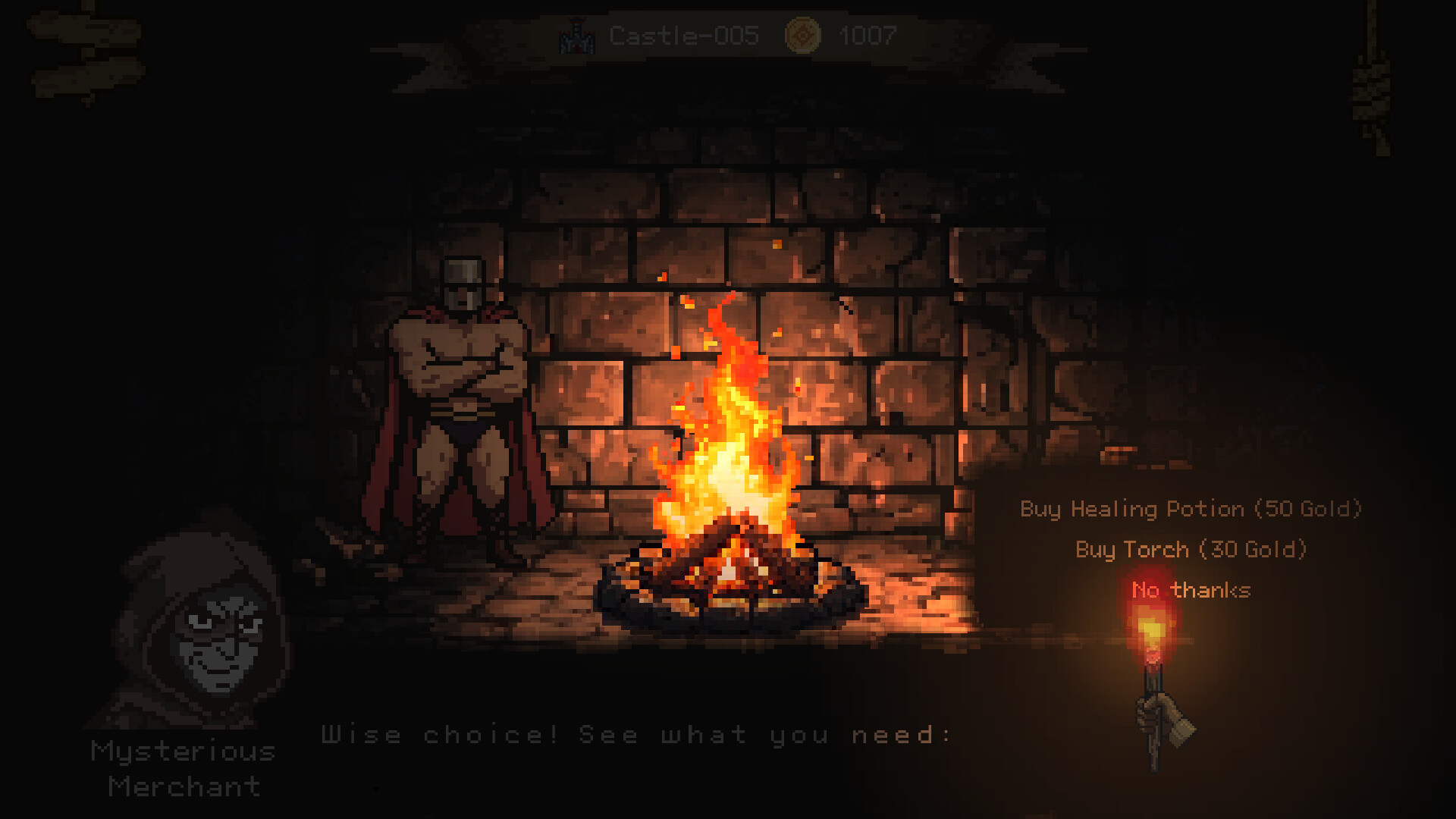 ここで休息し、補給を行うことができる。放浪の商人から、危険を冒して得た黄金でアイテムを購入できるのだ。それらアイテムは武器ではない――鍵であり、情報であり、打開不能に見えた扉すらも進路へと変える戦略的リソースだ。