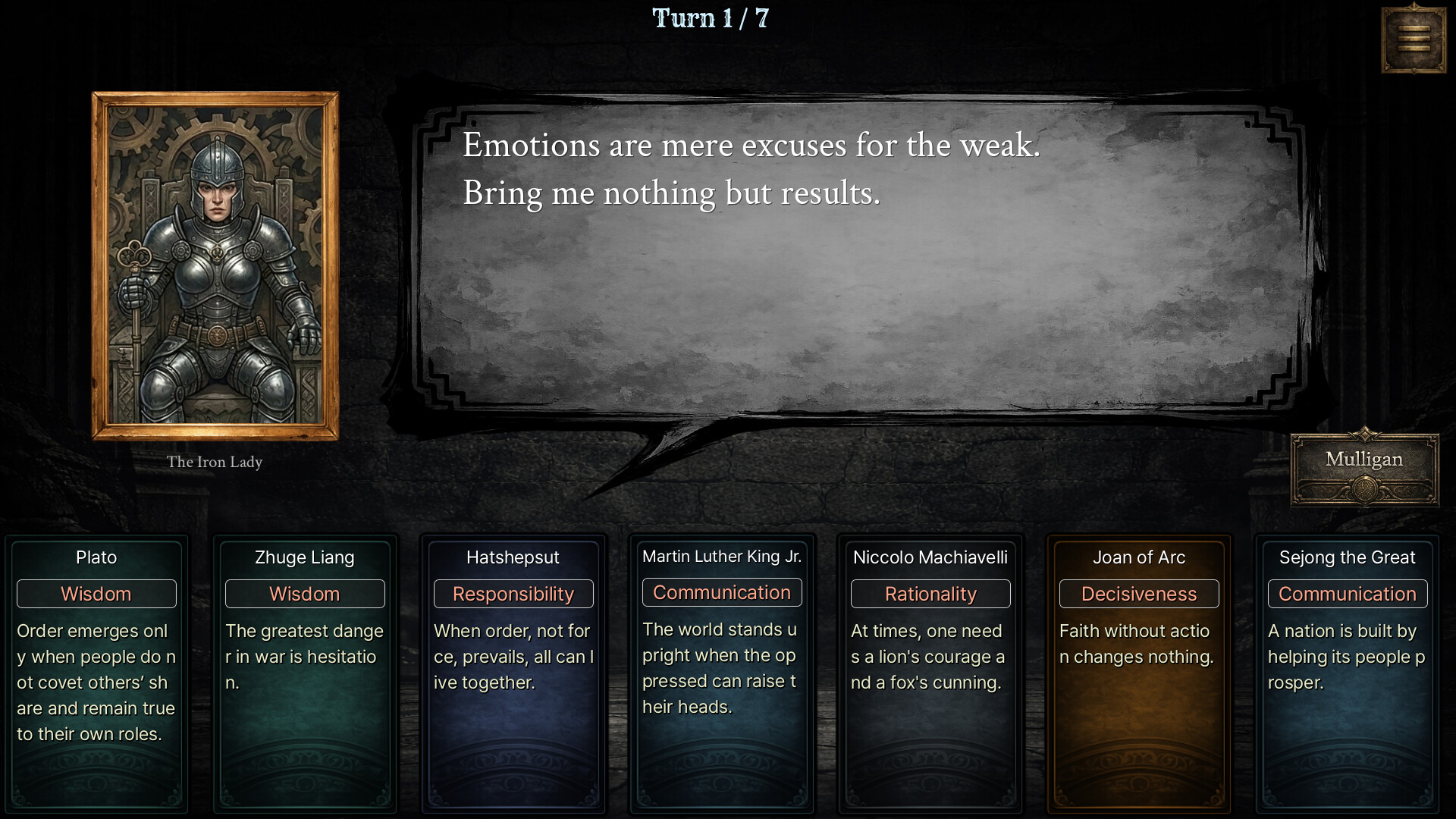 단 7턴의 논리 대결. 위인 카드로 빌런의 주장을 분석하고 반박하는 드래프트 기반 카드 전략 게임.