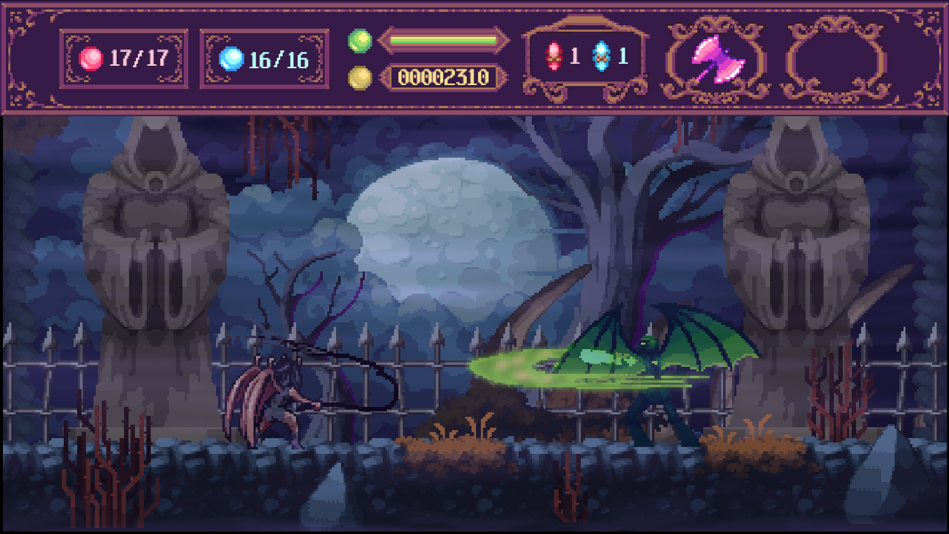 A 16‑bit dark fantasy action adventure with metroidvania‑style maps, RPG growth, and hidden secrets. Lead the Nightfall Empress through a mature journey suspended between the sacred and the profane.
