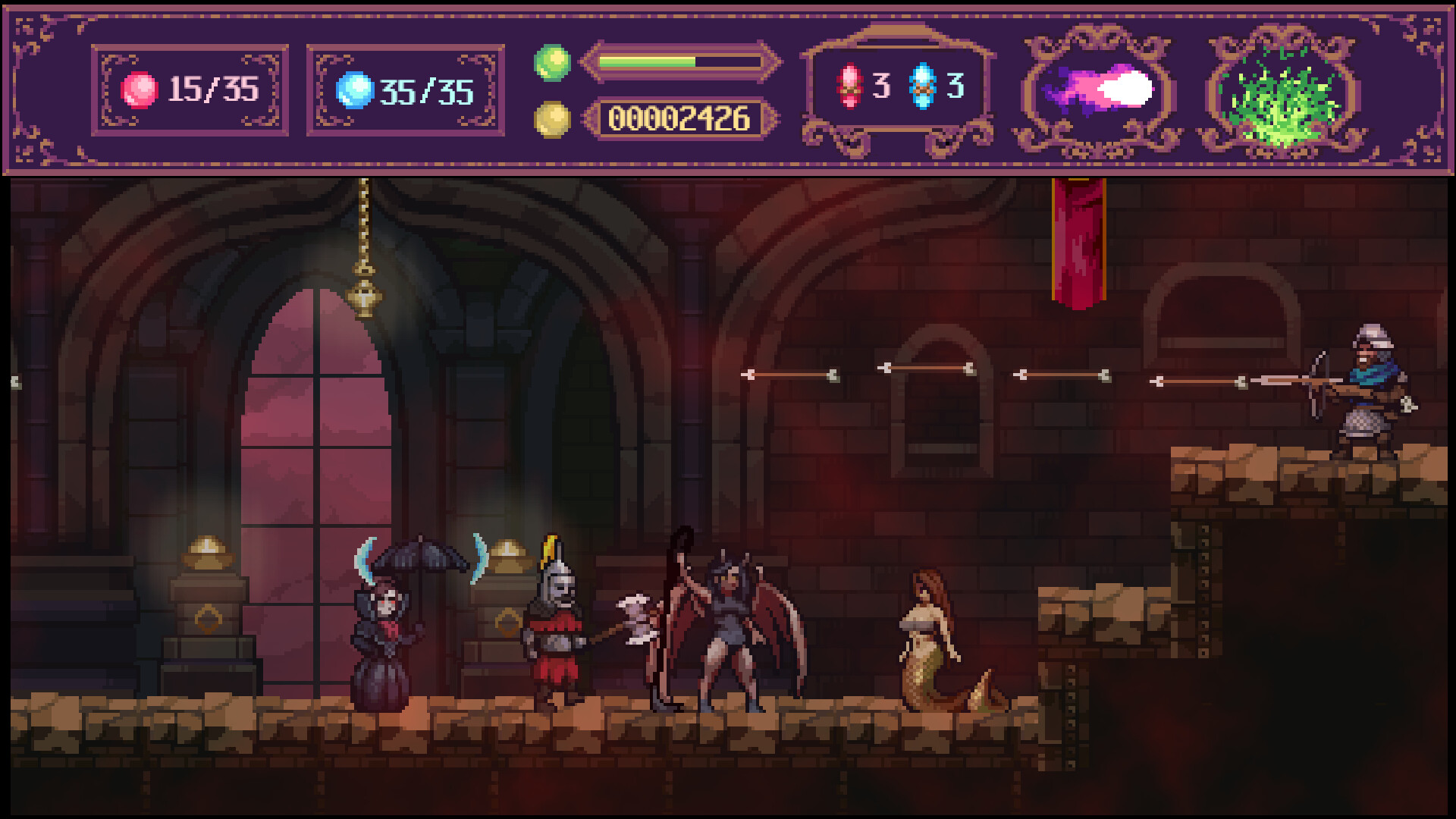 A 16‑bit dark fantasy action adventure with metroidvania‑style maps, RPG growth, and hidden secrets. Lead the Nightfall Empress through a mature journey suspended between the sacred and the profane.