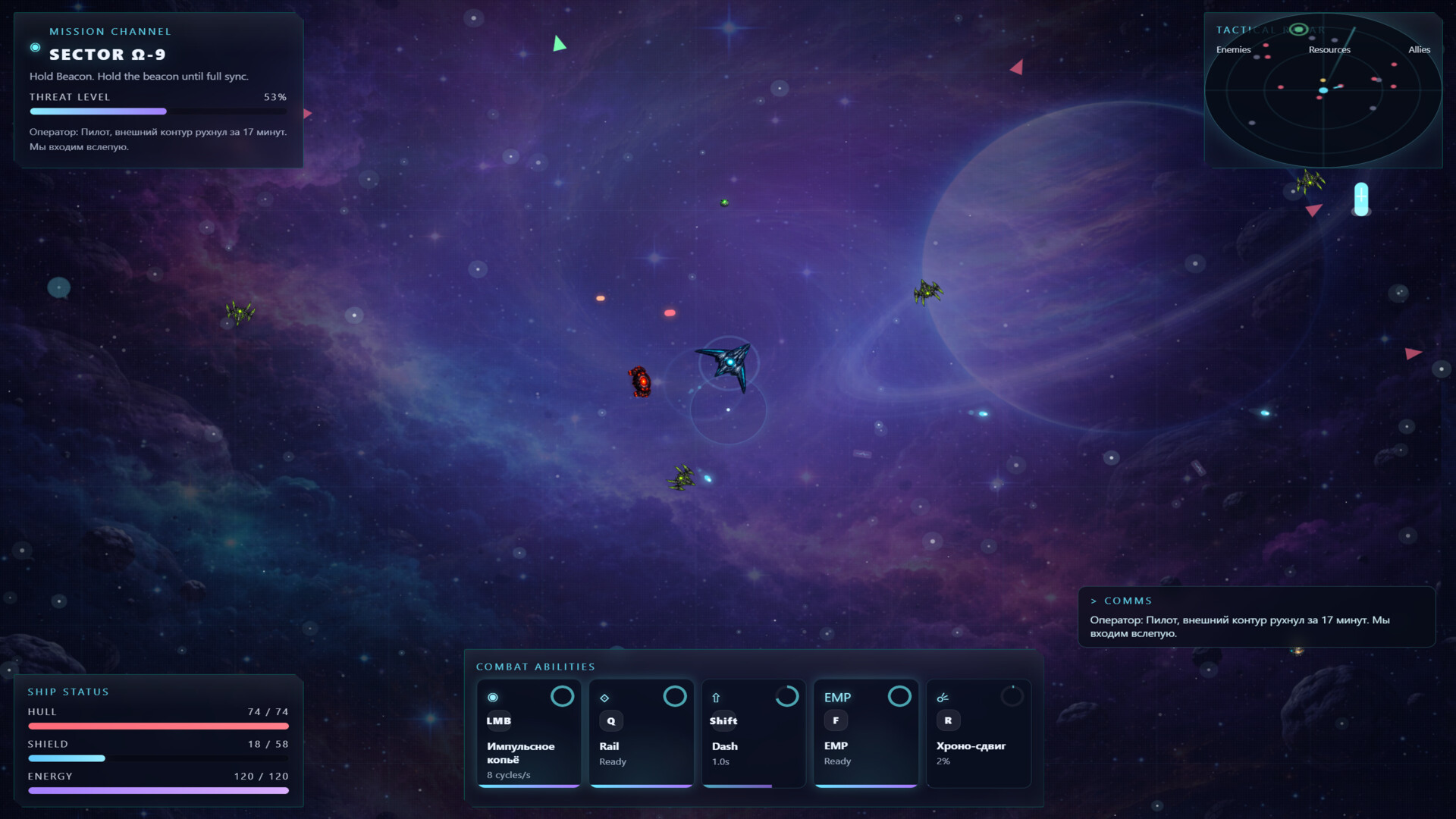 Top-down space combat shooter. 6 chassis, 8 weapons, 3 enemy factions, 3 bosses. Craft your build, fight through 12 sectors, survive endless waves, and compete in daily challenges. Global leaderboards.