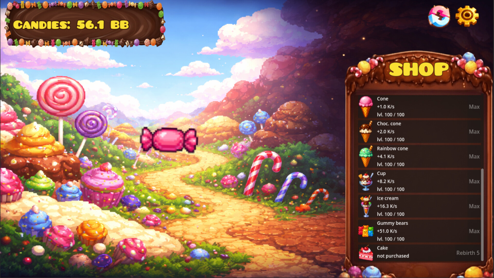 Tap the big candy and rake in millions. Buy upgrades, unlock passive income, rebirth for a permanent multiplier, and level up your skill tree. A chill clicker with offline progress—drop in for a minute or stay forever.