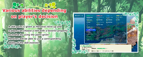 A skill point is given as Heroines level up and a player can choose a skill with a favorite property to evolve by using the point given. Heroines will be able to use a corresponding ability of the skill evolved.