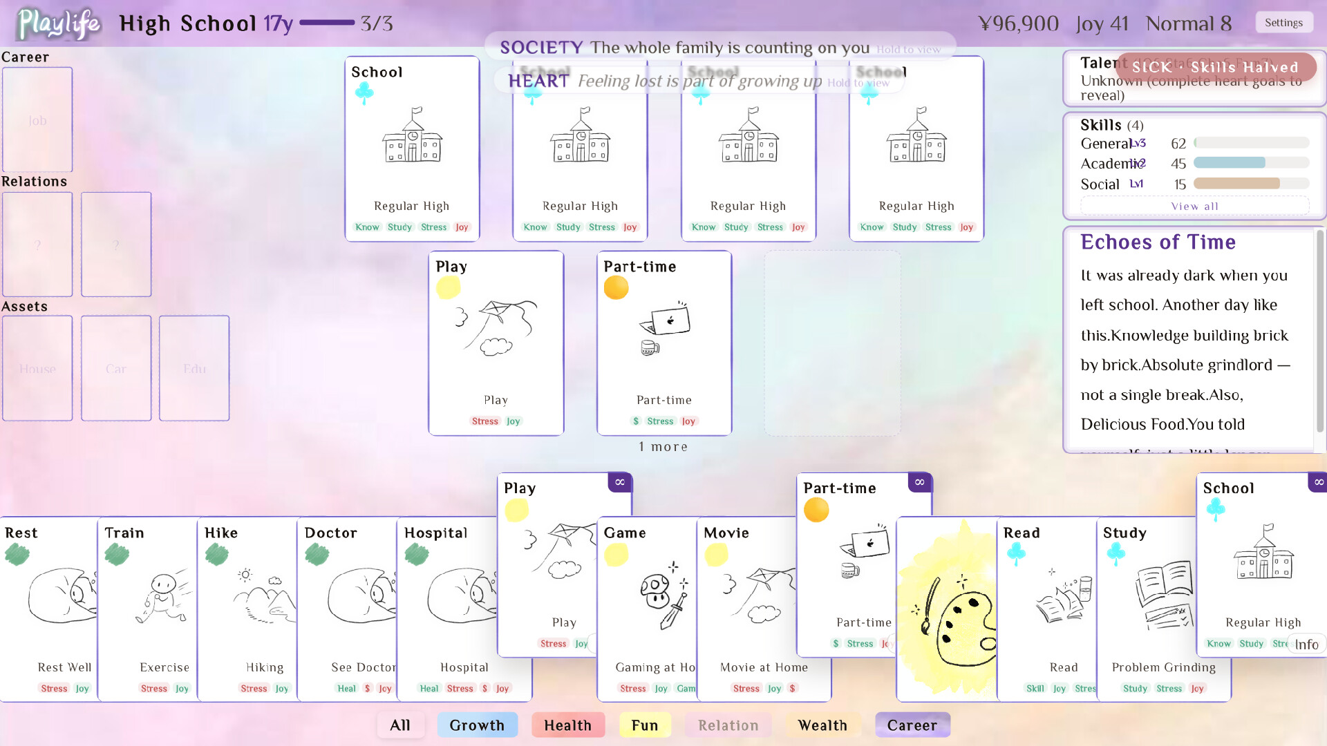 Parents expect good grades, college, a stable job, marriage, and kids — that's Society's Expectation. Fall short and face consequences. But what does your heart truly want? The Heart's Desire system lets you chase your dreams for unique rewards. Conform or rebel? Every step is a crossroads.