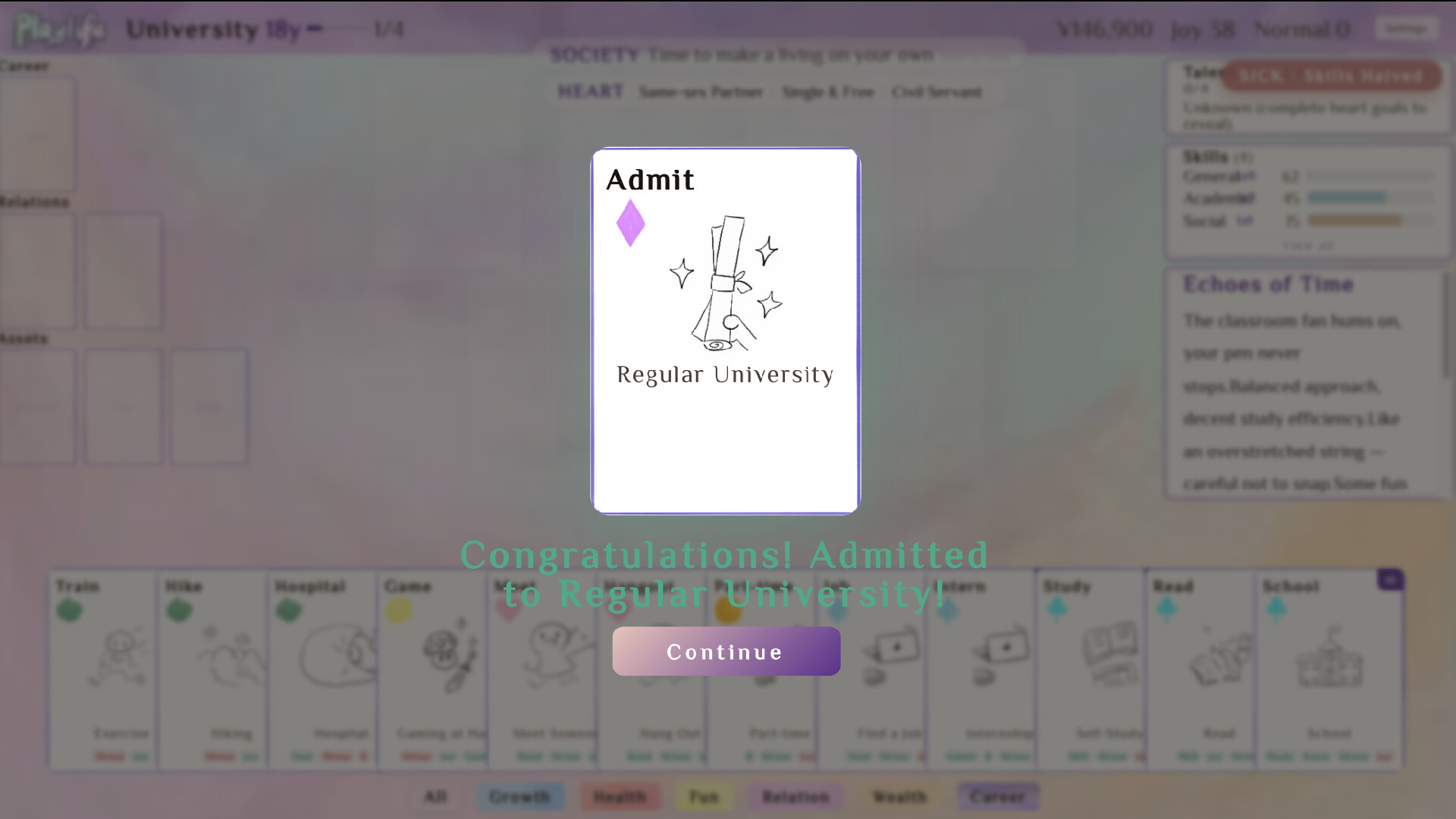 Parents expect good grades, college, a stable job, marriage, and kids — that's Society's Expectation. Fall short and face consequences. But what does your heart truly want? The Heart's Desire system lets you chase your dreams for unique rewards. Conform or rebel? Every step is a crossroads.
