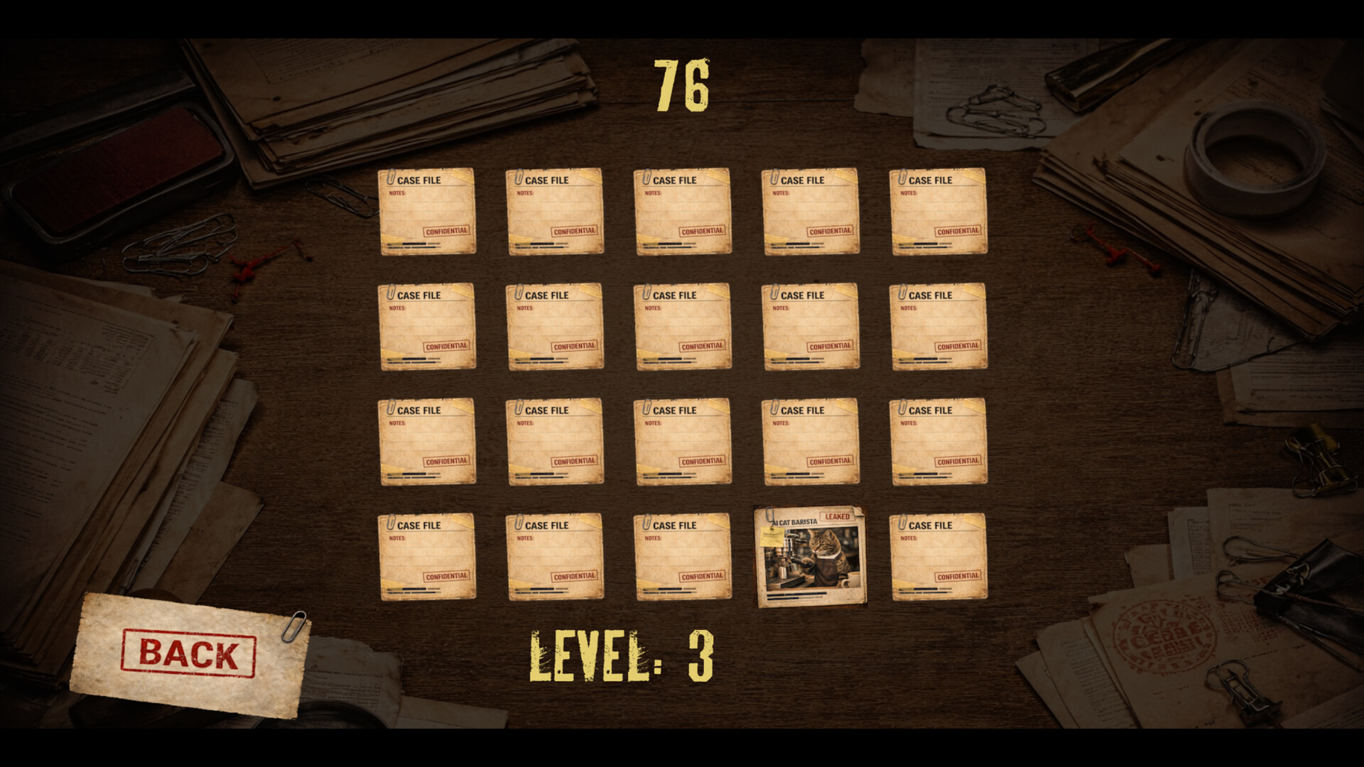 Every level feels like someone else’s file pulled from a dusty cabinet. You flip cards, look for matching pairs, try to keep their positions in your head, and race the clock while it ticks in the background. Make a mistake — that’s on you. Hesitate — also on you. Start clicking at random — the archive will quickly remind you that your memory is not nearly as impressive as you thought.