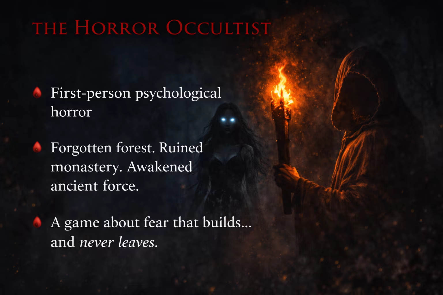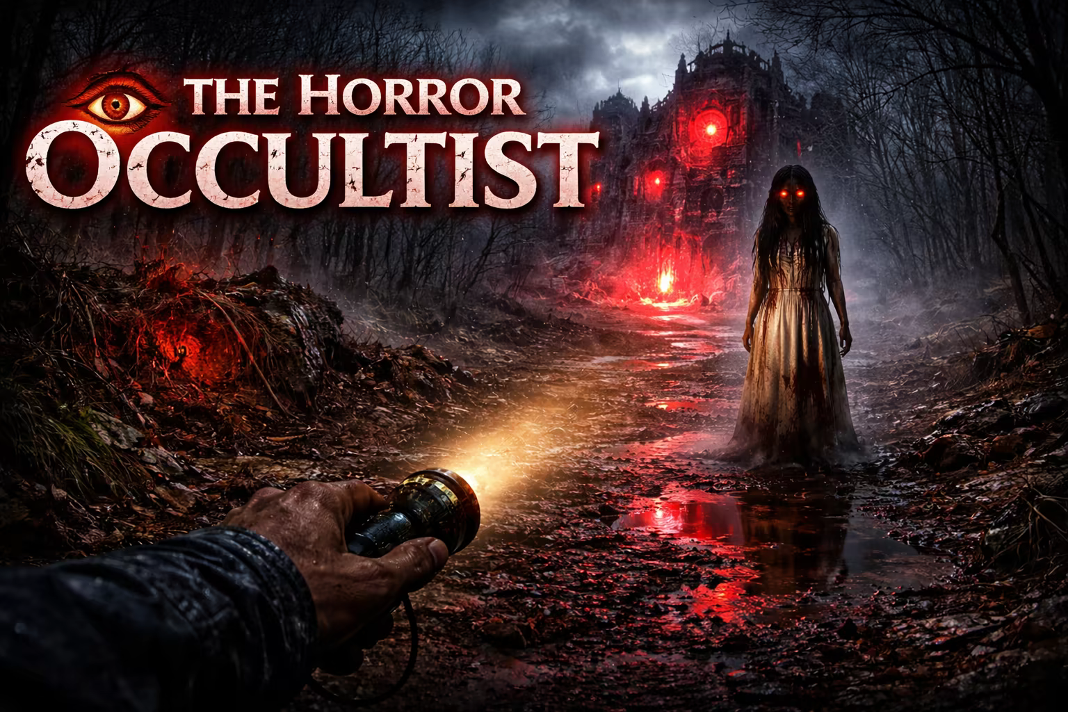 The Horror Occultist is a first-person psychological horror game. Explore a cursed forest and the ruins of an abandoned monastery where an ancient force was awakened. Uncover the truth, avoid the cult, and survive what watches from the dark.