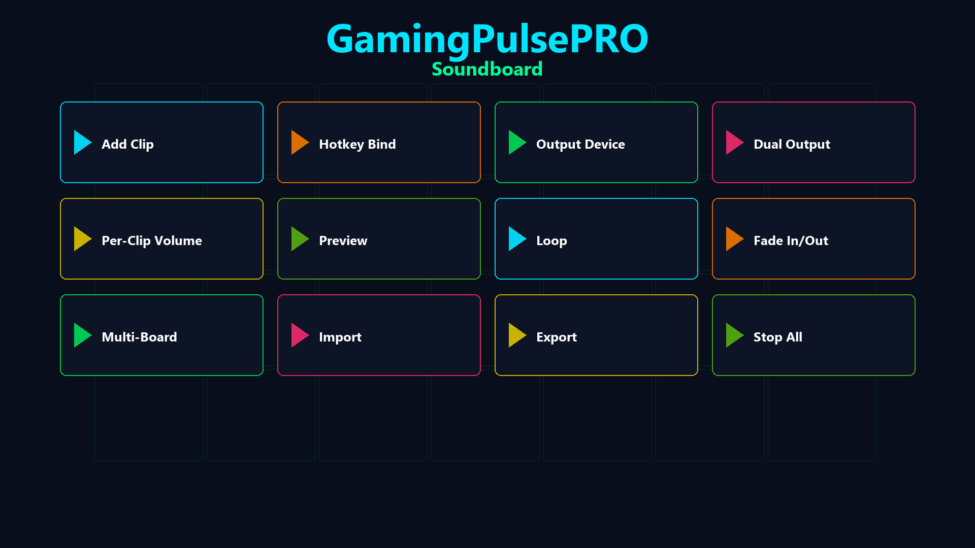 Ein vollwertiges Audio-Board direkt in GamingPulsePRO. Binden Sie jede WAV- oder MP3-Datei an einen Hotkey, leiten Sie Audio über ein virtuelles Kabel in Ihren Voice-Chat und verwalten Sie mehrere Boards — alles ohne Latenz. 🎯