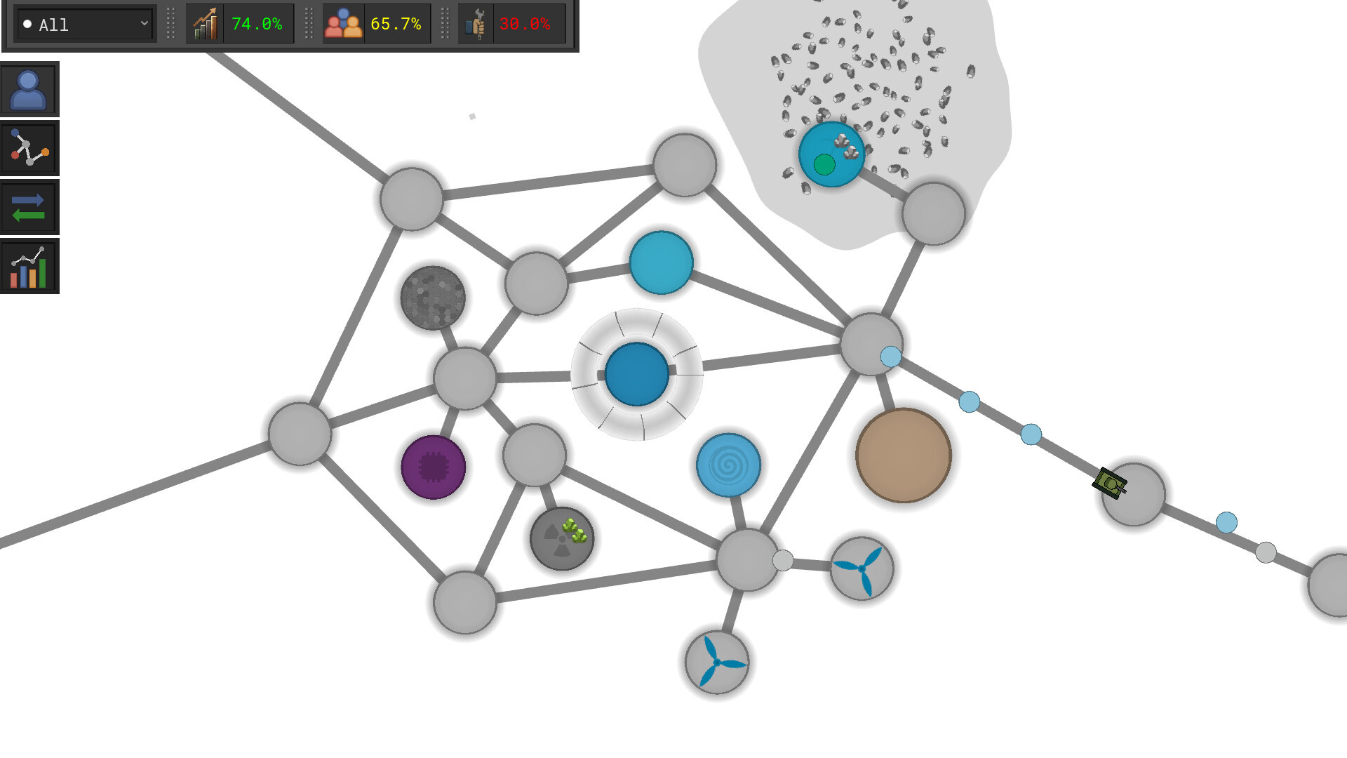 Place modules and connect them into a network. Position matters because distance affects transport efficiency, power distribution, and defense. Clustering related modules speeds up logistics and reduces power loss, but concentrating critical infrastructure in one place creates a vulnerability. Every layout decision is a tradeoff.