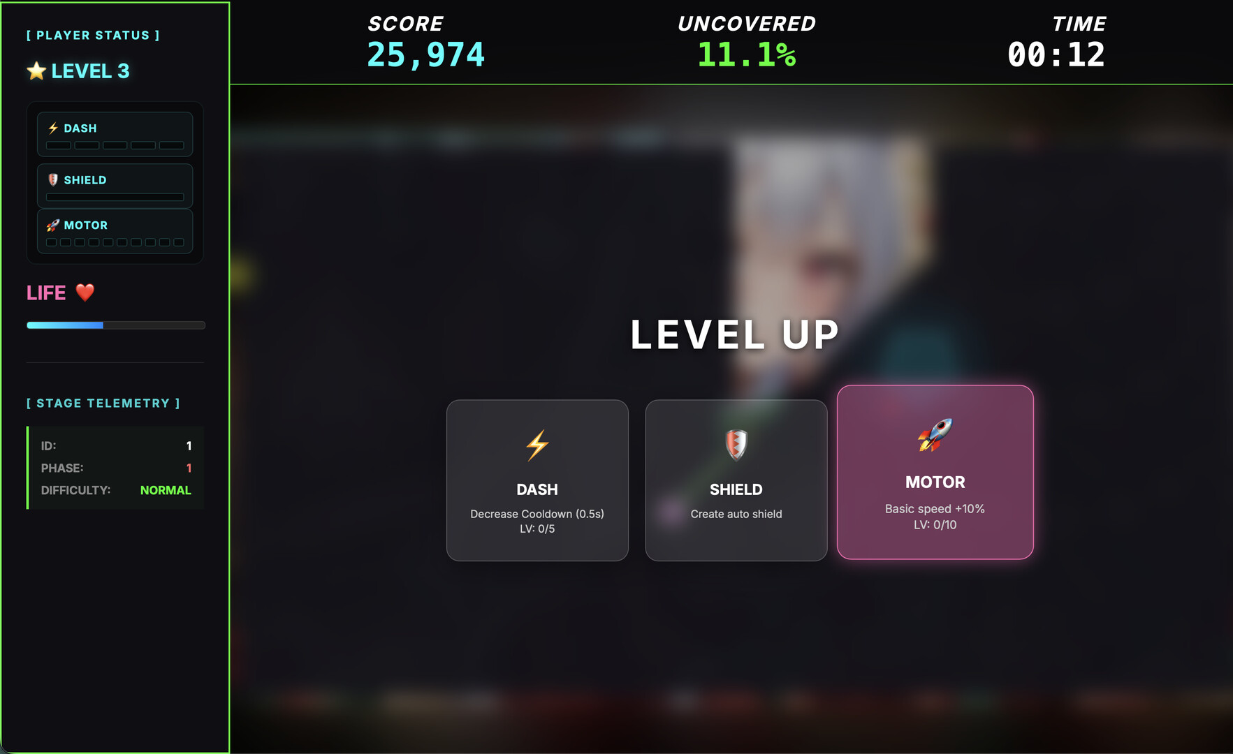 ค้นพบศิลปะที่ซ่อนอยู่ในเกมอาร์เคดสไตล์ Qix(Gals Panic) แนว neon synthwave! หลบกระสุน ยึดพื้นที่ 80% และอัปเกรดทักษะ Dash, Shield, Motor เพื่อสยบบอสที่วิวัฒนาการได้ สนุกไม่รู้จบกับ Custom Mode เปลี่ยนรูปภาพของคุณเป็นด่าน! Project Uncover: ศิลปะและแอ็กชันไร้ขีดจำกัด