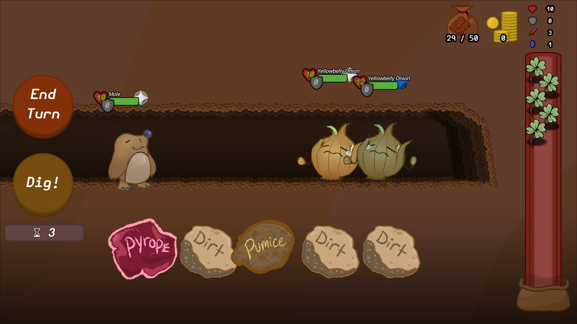 Mountains & Molehills is a turn-based, deck-building rogue-like where the earth you dig becomes your cards! Dig through stages and encounter fierce foes ranging from a crying onion to a massive maned lion made of mushroom!