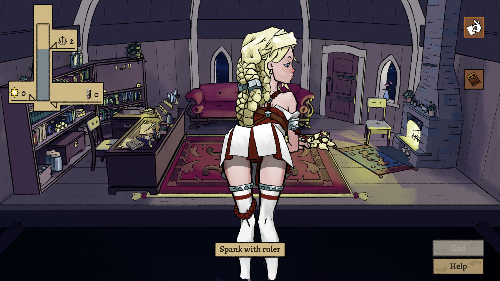 This game may contain content not suitable for all ages. This includes nudity, sexual acts, mature content, chastity, denial, bondage/shibari, BDSM, and spanking. All characters are over the age of 20.