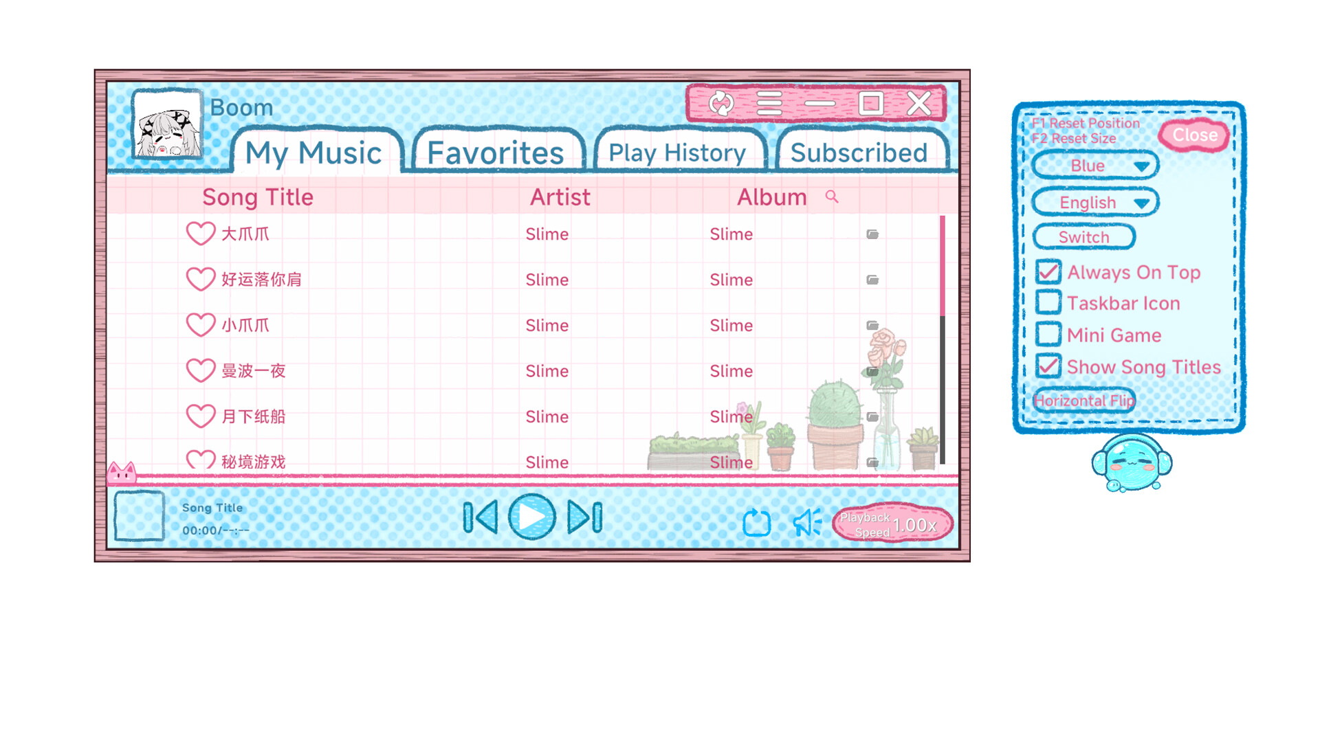 Dahili tam müzik oynatma yönetimi modülü, şarkı koleksiyonu, oynatma geçmişi gözden geçirme ve albüm sınıflandırma ve organizasyonunu destekler. Özel çalma listelerinizi serbestçe yönetebilir, slime'ı sevdiğiniz müzik dünyasına dalmanızda yanınızda tutabilirsiniz;