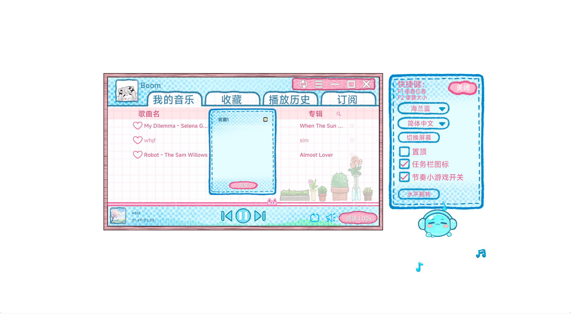 • 内置完整的音乐播放管理模块,支持歌曲收藏、播放历史回溯、专辑分类整理,你可以随心管理自己的专属歌单,让史莱姆陪你沉浸在喜欢的音乐世界里;