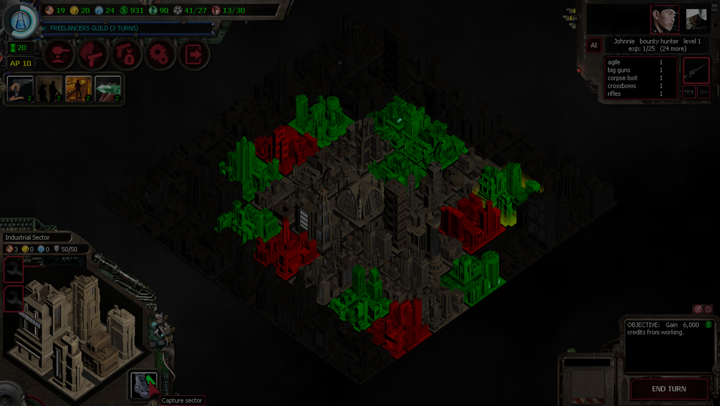 • EXPLORE AND EXPAND: Restore derelict metropolises, one turn at a time! How will you spend your Action Points this turn? Will you scout a nearby sector, then clean your weapons and check out a new recruit? Or will you patch the hole in your defenses and then blindly move into unexplored territory?