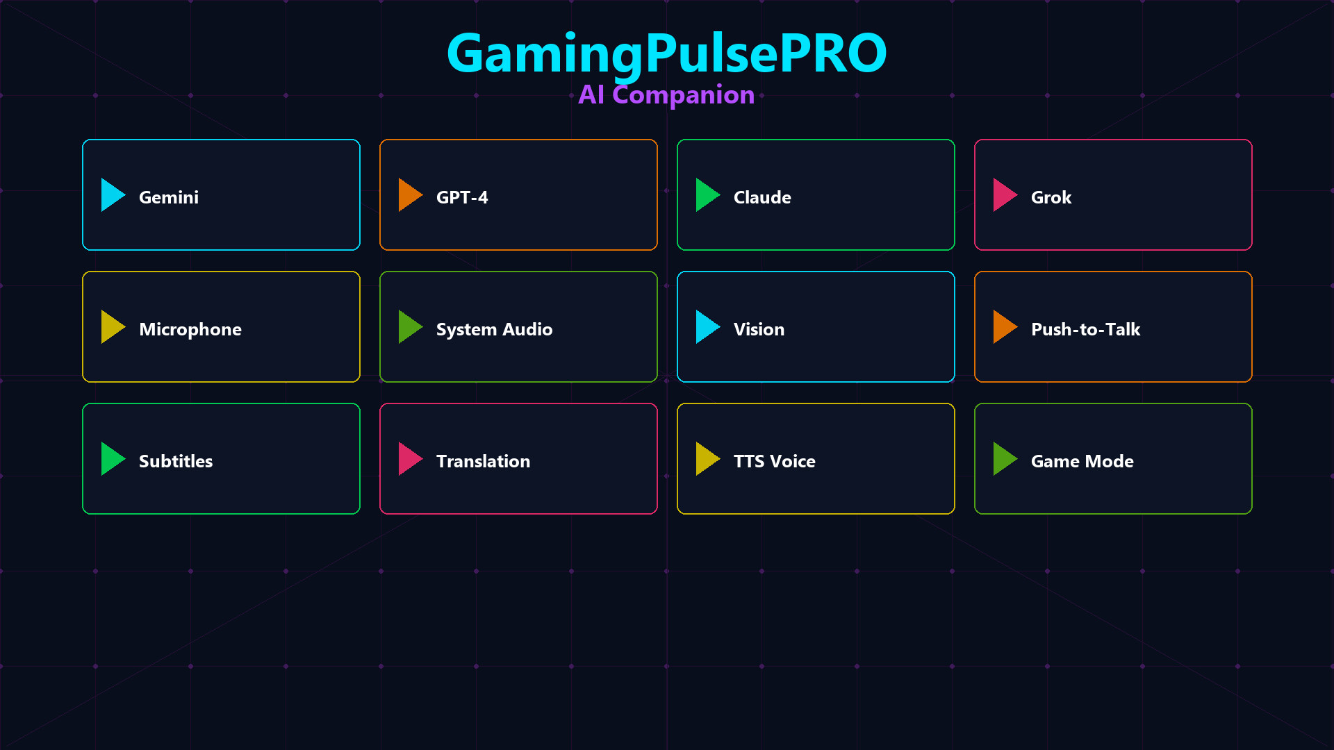 Ihr persönlicher KI-Assistent direkt in GamingPulsePRO. Wählen Sie aus vier großen KI-Anbietern, chatten Sie per Sprache oder Text, erfassen Sie Ihren Bildschirm in Echtzeit und lassen Sie die KI sehen, was Sie sehen. Ein schwebendes Overlay, das Sie bei jedem Spiel begleitet. 🎯