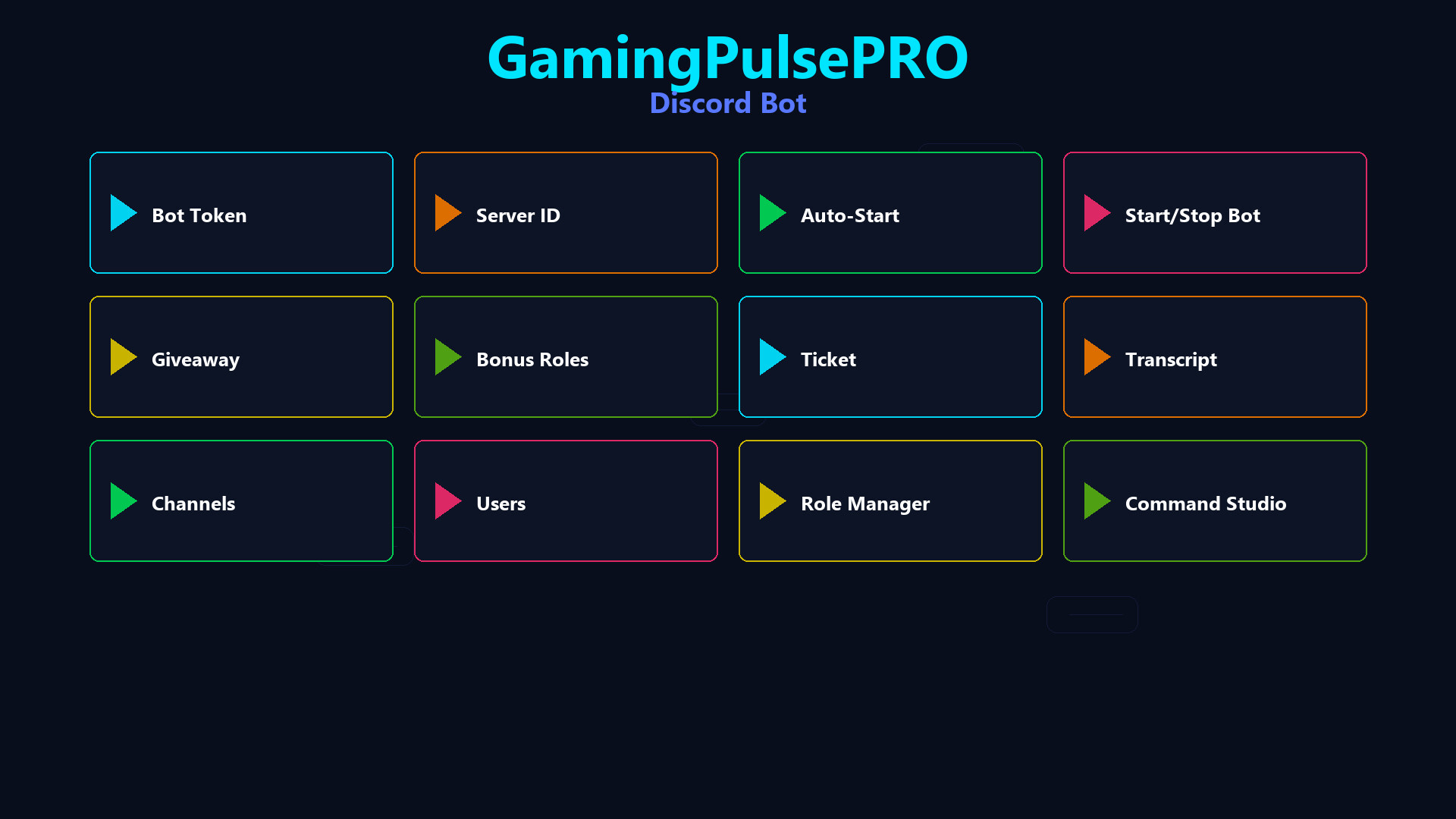 A complete Discord bot manager that runs entirely on your PC. Set up giveaways, support tickets, welcome messages, role assignments, custom commands and Rich Presence — without paying for hosting or managing external servers. 🎯