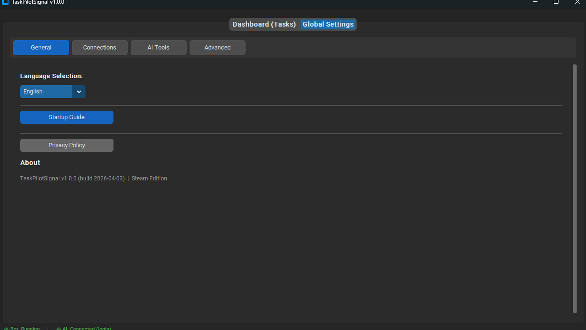 TaskPilotSignal is a Windows desktop app that connects Telegram workflows with AI-powered task automation.