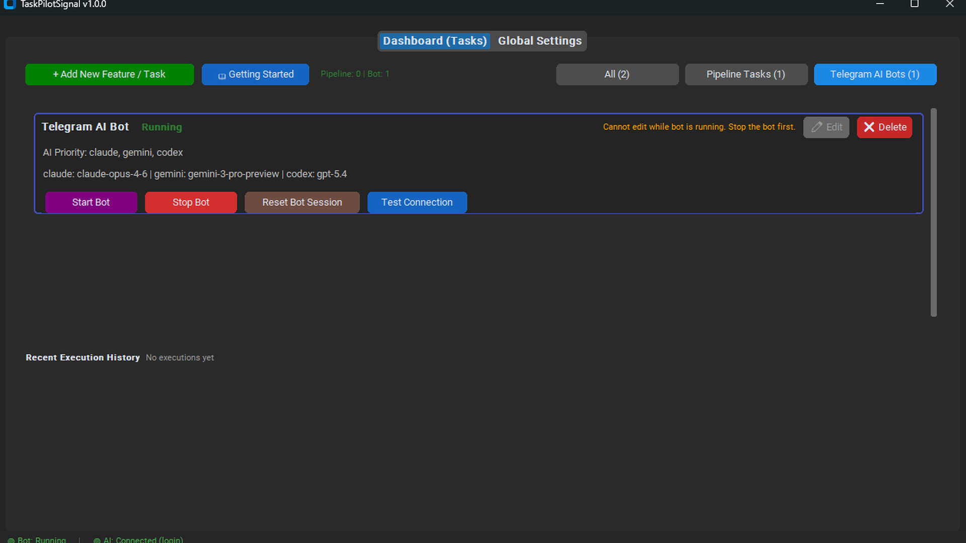 TaskPilotSignal은 텔레그램과 AI 작업 자동화를 연결하는 Windows 데스크톱 앱입니다.