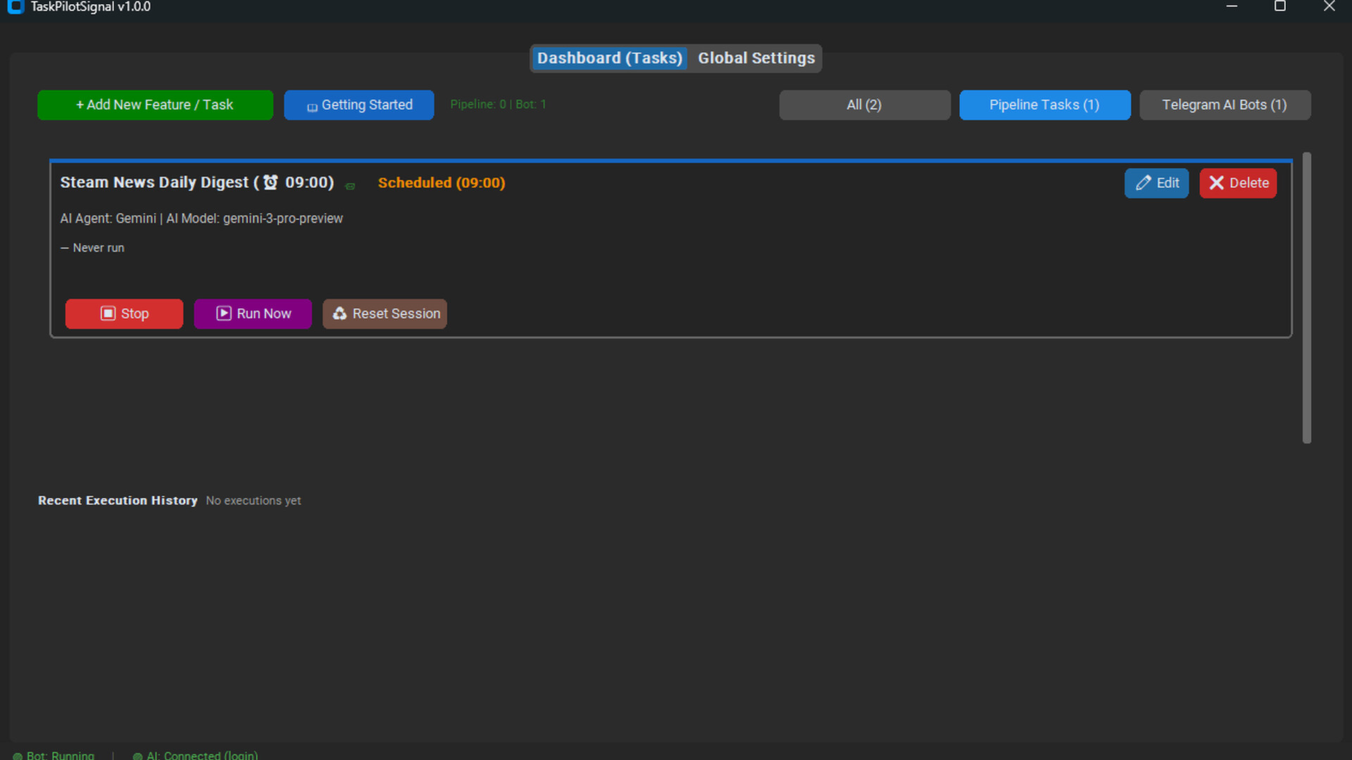 TaskPilotSignal is a Windows desktop tool for Telegram bot conversations, scheduled pipelines, and AI task execution in one place. It can switch between Gemini, Claude, and Codex, but it still requires internet access and external account setup.