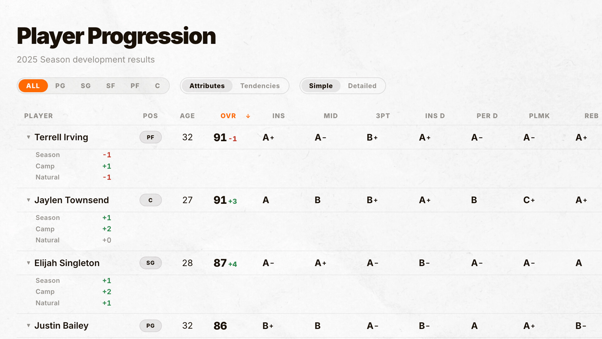 Player development isn't a random number generator. Each offseason, assign players to specialized training camps: perimeter shooting, interior defense, playmaking, and more all with position-specific effectiveness. Pair young players with veteran mentors and watch the mentorship bonus compound. Work ethic, age curves, and potential tiers all shape whether or not your lottery pick becomes a franchise cornerstone.