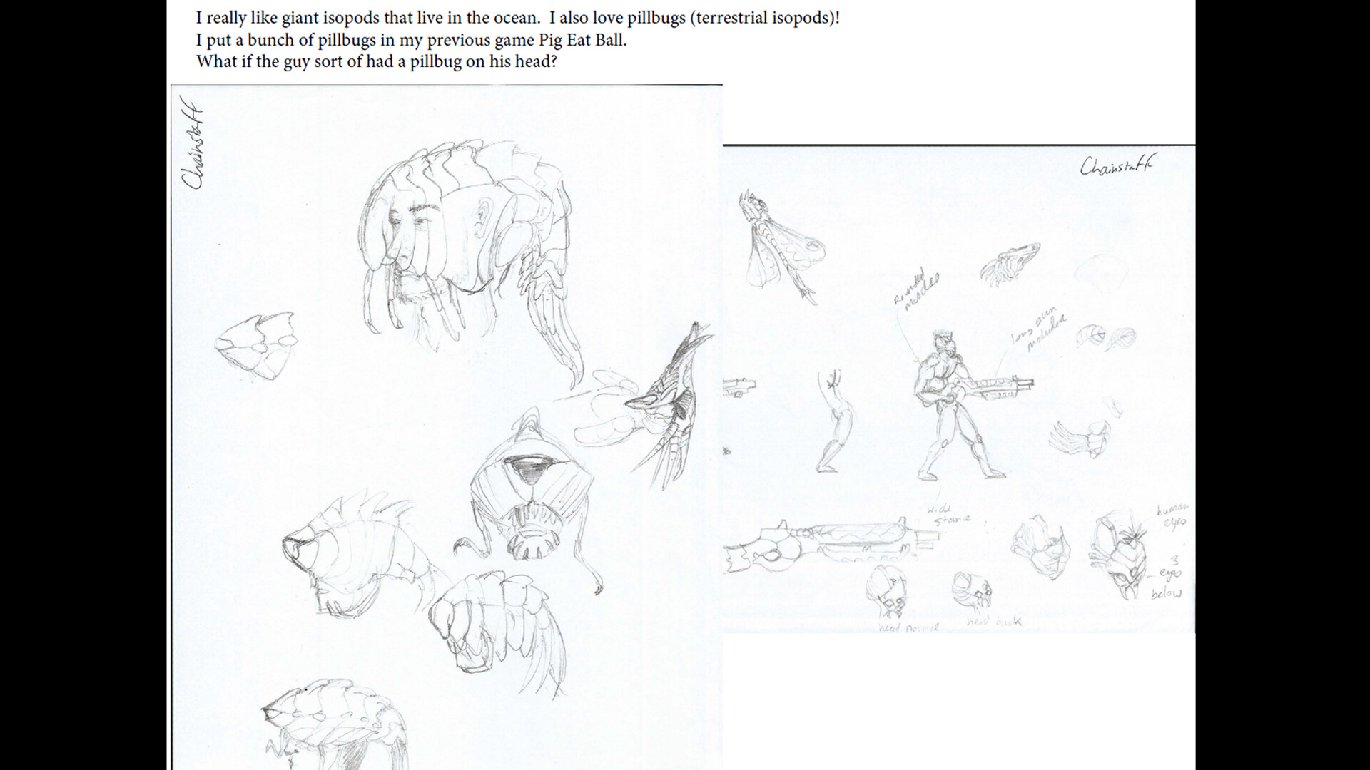Revel in the surreal world of ChainStaff and bask in the glory of album-cover style art. Explore how the extensive drawings, sketches, and iterations eventually led to the finished monster and level designs! Sometimes there were real twists and turns in the development. This is the behind-the-scenes view of how the game was made, and even some things left on the cutting room floor that didn't make it into the game!